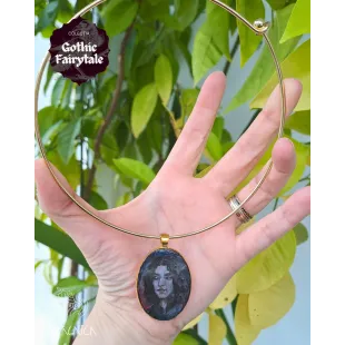 Colier cu pandantiv modelat manual din lut polimeric, apoi pictat manual. cu vopsele acrilice. Lant din oțel inoxidabil cu adăugiri cu pietre semiprețioase. Colecția Gothic Fairytale vorbește despre ceea ce se află ascuns în umbre, despre mister și taine neștiute. Natura umană și supranaturalul se împletesc pentru a da naștere unor bijuterii unice, cu o estetică aparte, ce amintesc de Dracula lui Bram Stoker sau de universul lui Edgar Allan Poe. Fiecare piesă este OOAK (one of a kind -unicat).