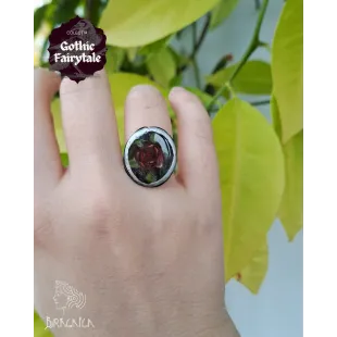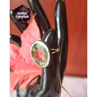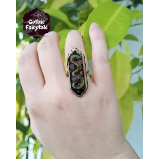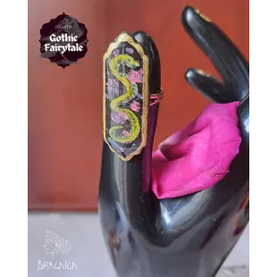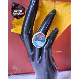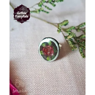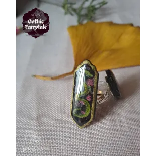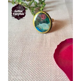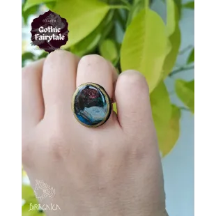Inel ajustabil pictat manual cu culori acrilice, apoi încastrat în rășină epoxidică. Colecția Gothic Fairytale vorbește despre ceea ce se află ascuns în umbre, despre mister și taine neștiute. Natura umană și supranaturalul se împletesc pentru a da naștere unor bijuterii unice, cu o estetică aparte, ce amintesc de Dracula lui Bram Stoker sau de universul lui Edgar Allan Poe. Fiecare piesă este OOAK (one of a kind -unicat).