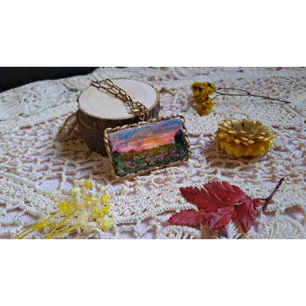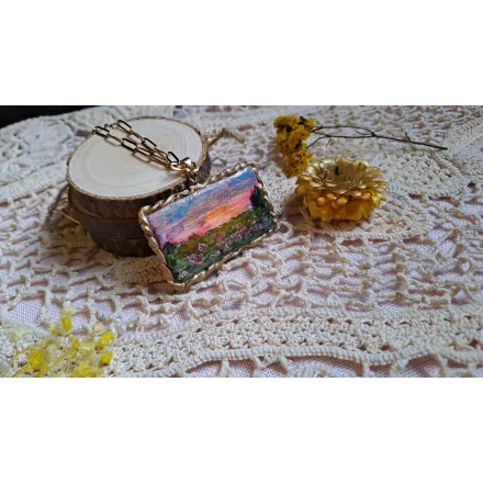 Apus de soare si parfum de trandafiri. Ce poate fi mai romantic? Colier cu pandantiv din lut polimeric, pictat manual. Accesoriile sunt din oțel inoxidabil.