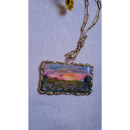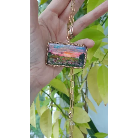 Colier cu pandantiv din lut polimeric incastrat, apoi pictat manual cu vopsele acrilice. O pictura miniaturala gata de a fi purtata. Accesorii din otel inoxidabil.