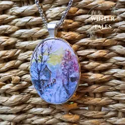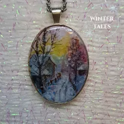 Colier cu pandantiv lut polimeric tip bezel cu baza metal, pictat manual, cu vopsele acrilice. Accesoriile sunt din otel inoxidabil.  Colecția Winter Tales inspiră acea liniște aparte a iernii, în care fiecare fulg pare să spună o poveste. Fiecare piesă este o mică lume închisă în rășină, pictată manual cu vopsele acrilice și surprinde în nuanțe delicate și detalii fine peisaje, animale și lumi fermecate. Fiecare bijuterie poartă în ea un strop de nostalgie și te va duce cu gândul la poveștile copilăriei. Fiecare piesă este OOAK (one of a kind -unicat).