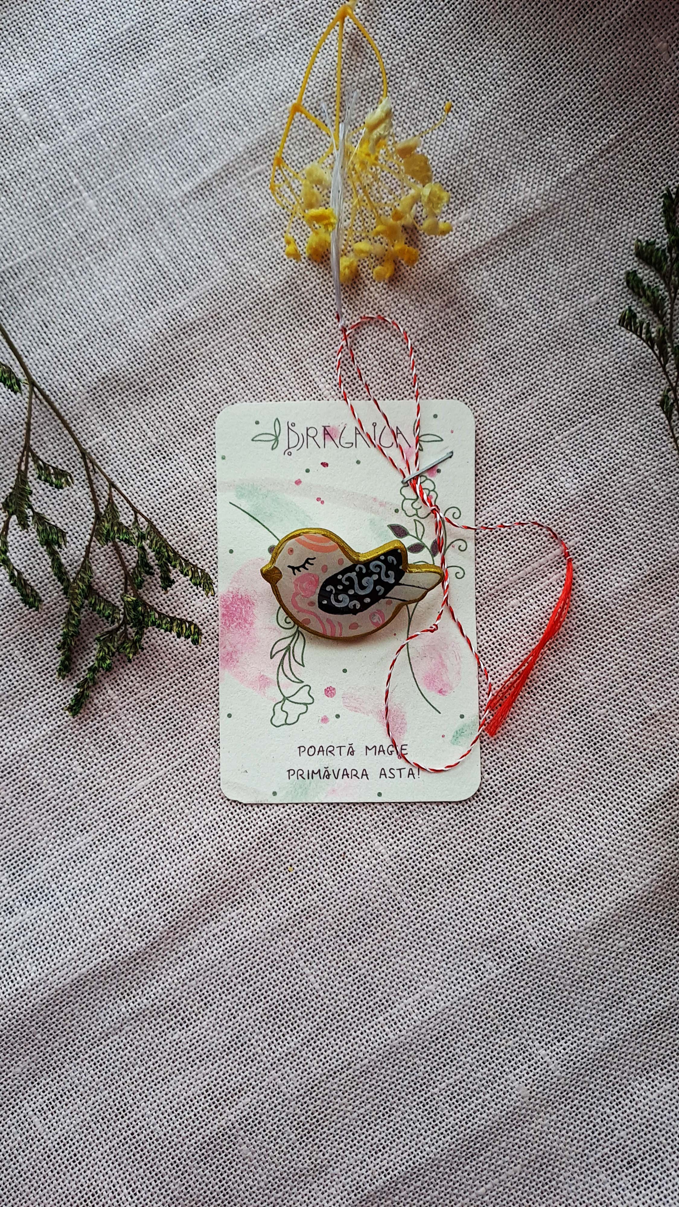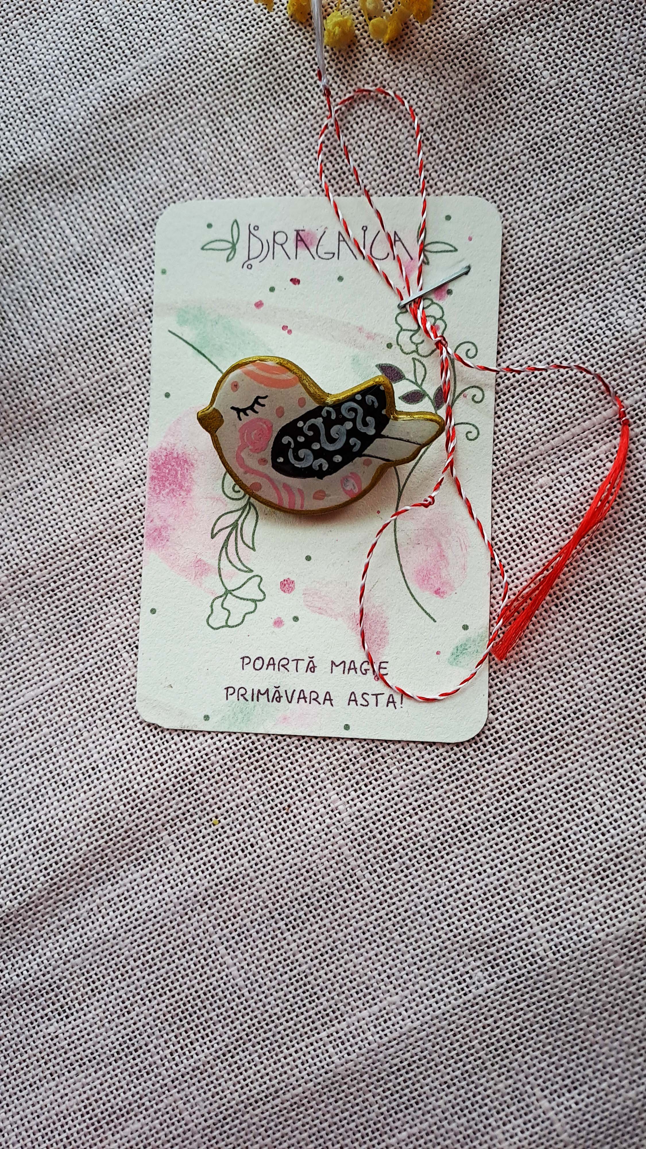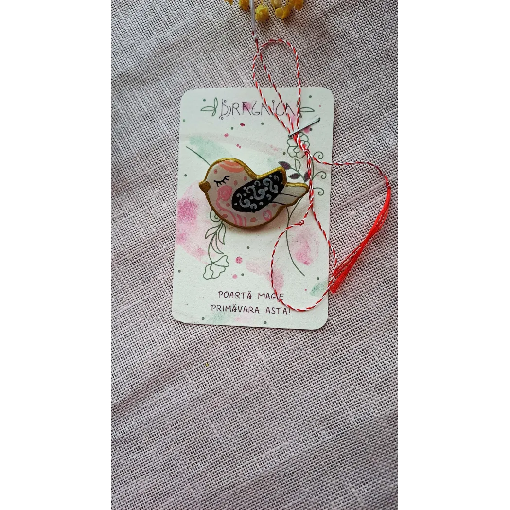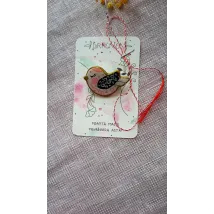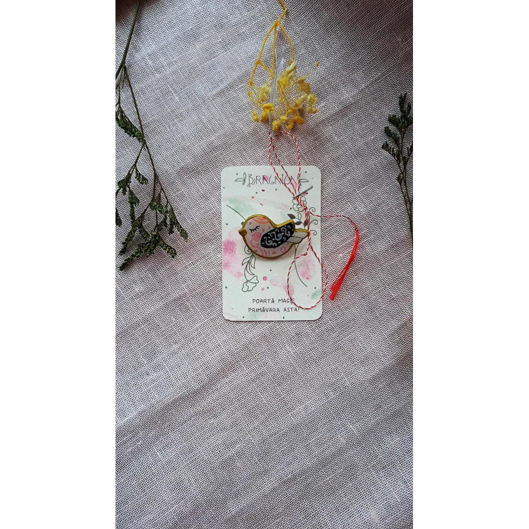 Broșă realizată din lut, pictată manual și încastrată în rășină.