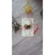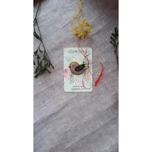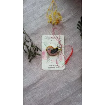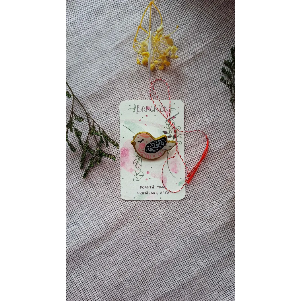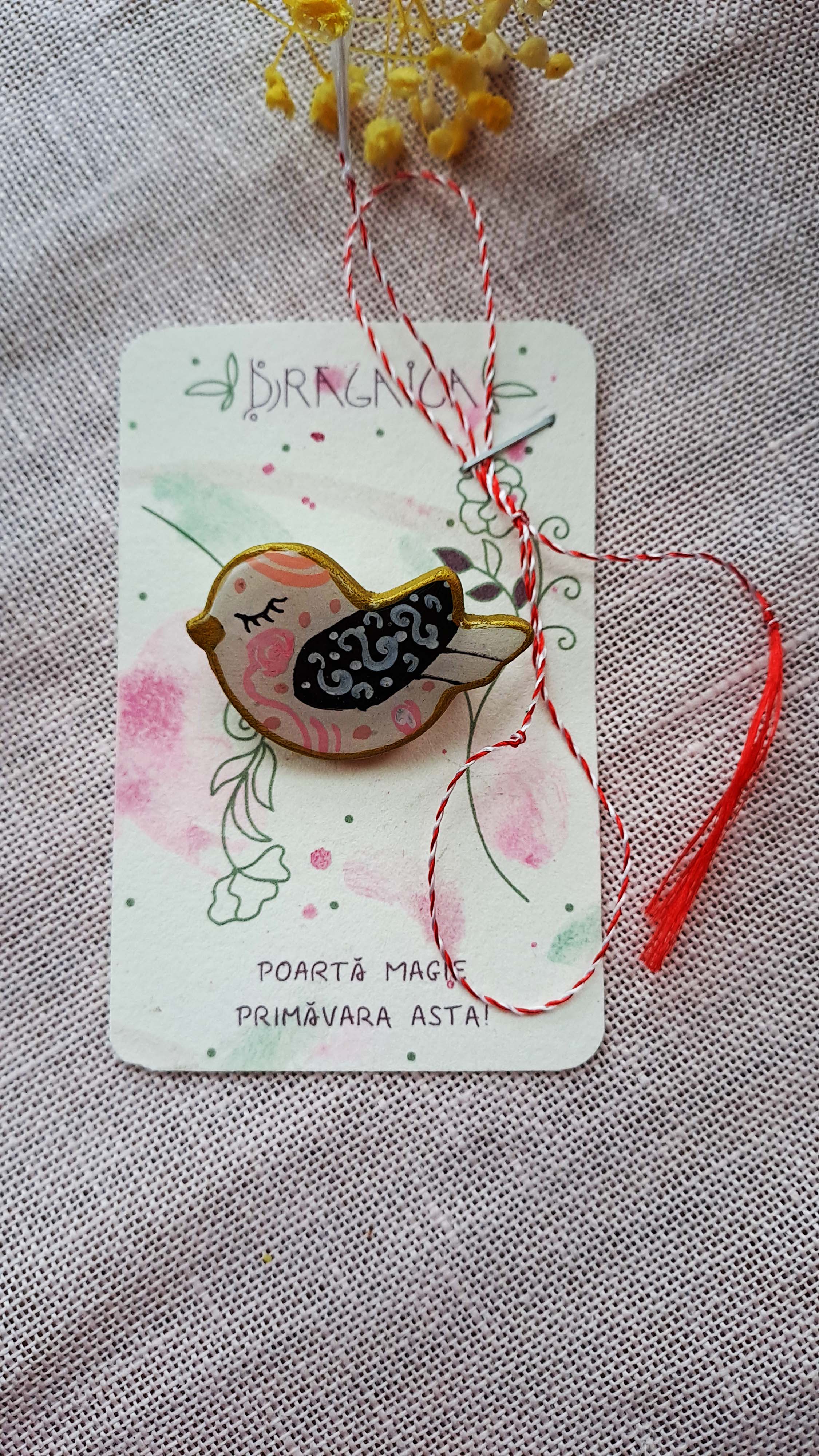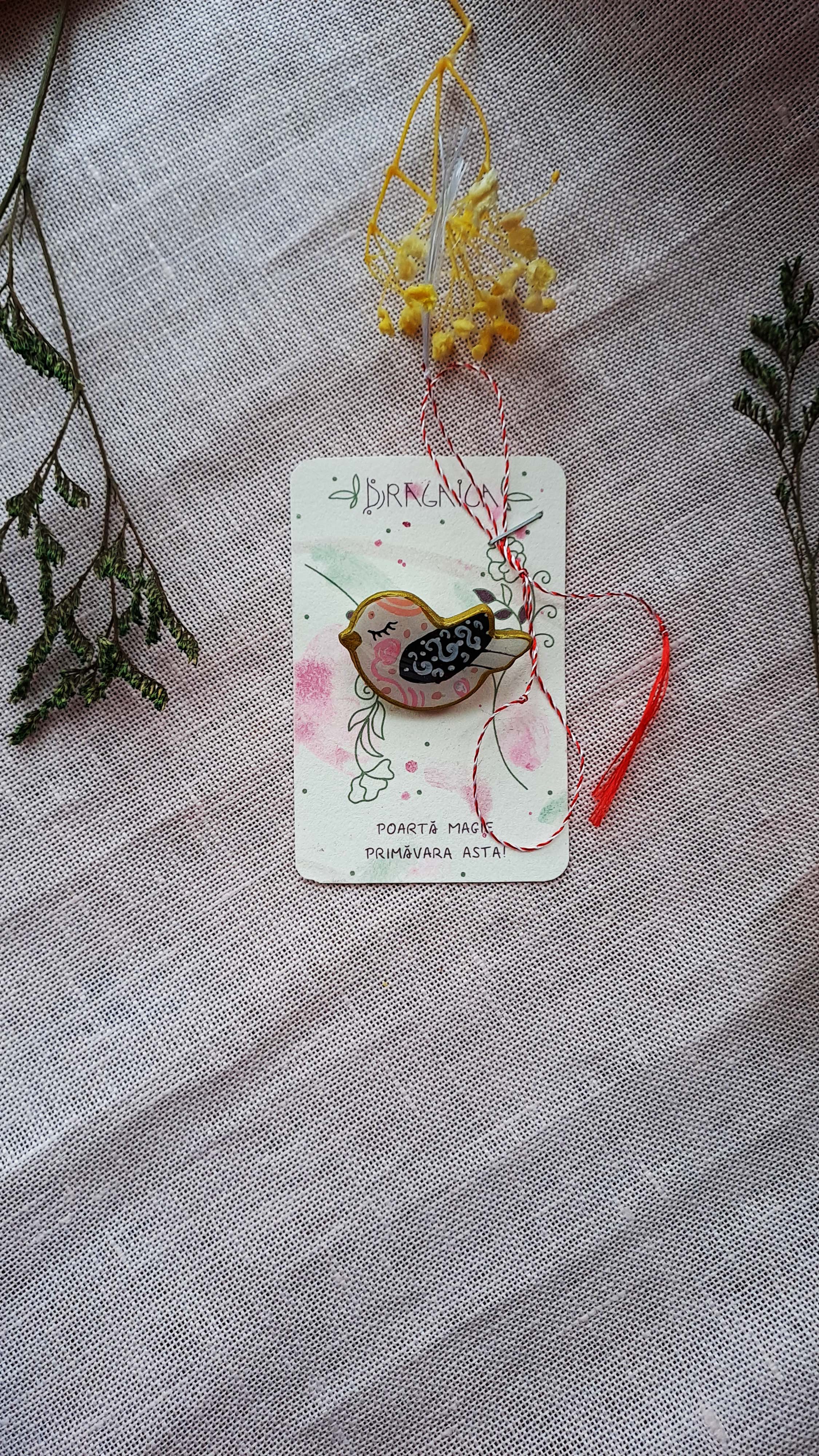Broșă realizată din lut, pictată manual și încastrată în rășină.