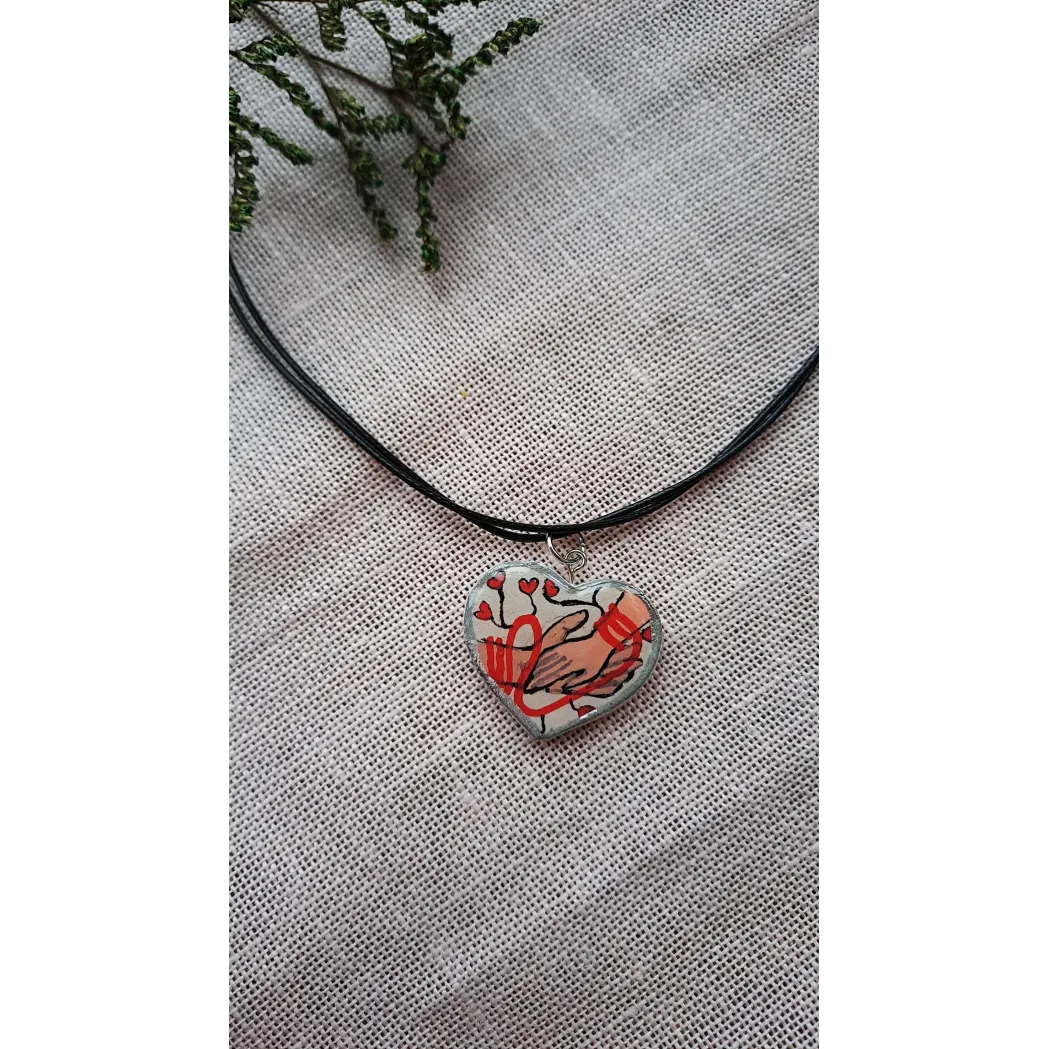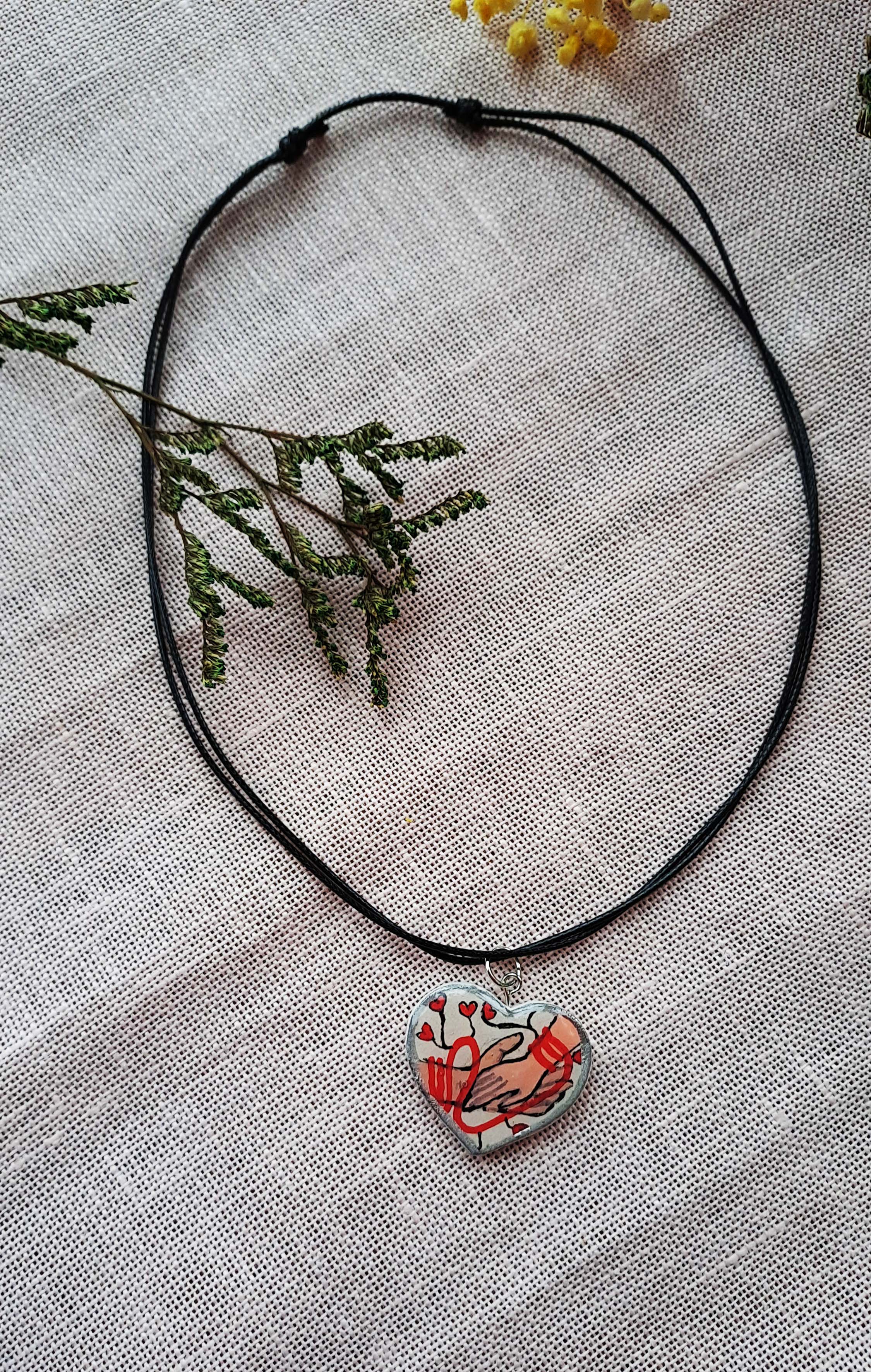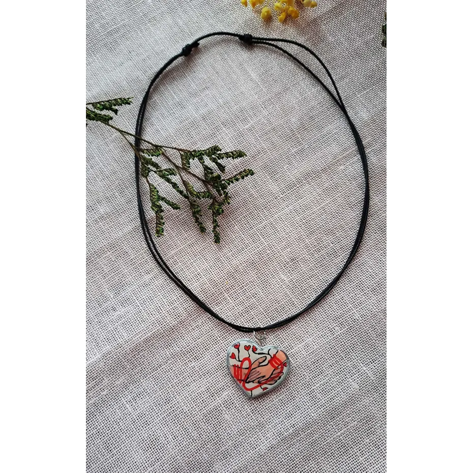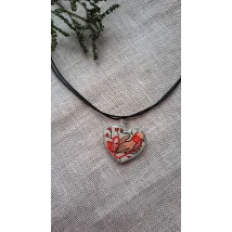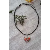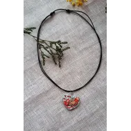 Colier cu pandantiv din lut pictat manual și apoi încastrat în rășină, pe șnur cerat, reglabil.