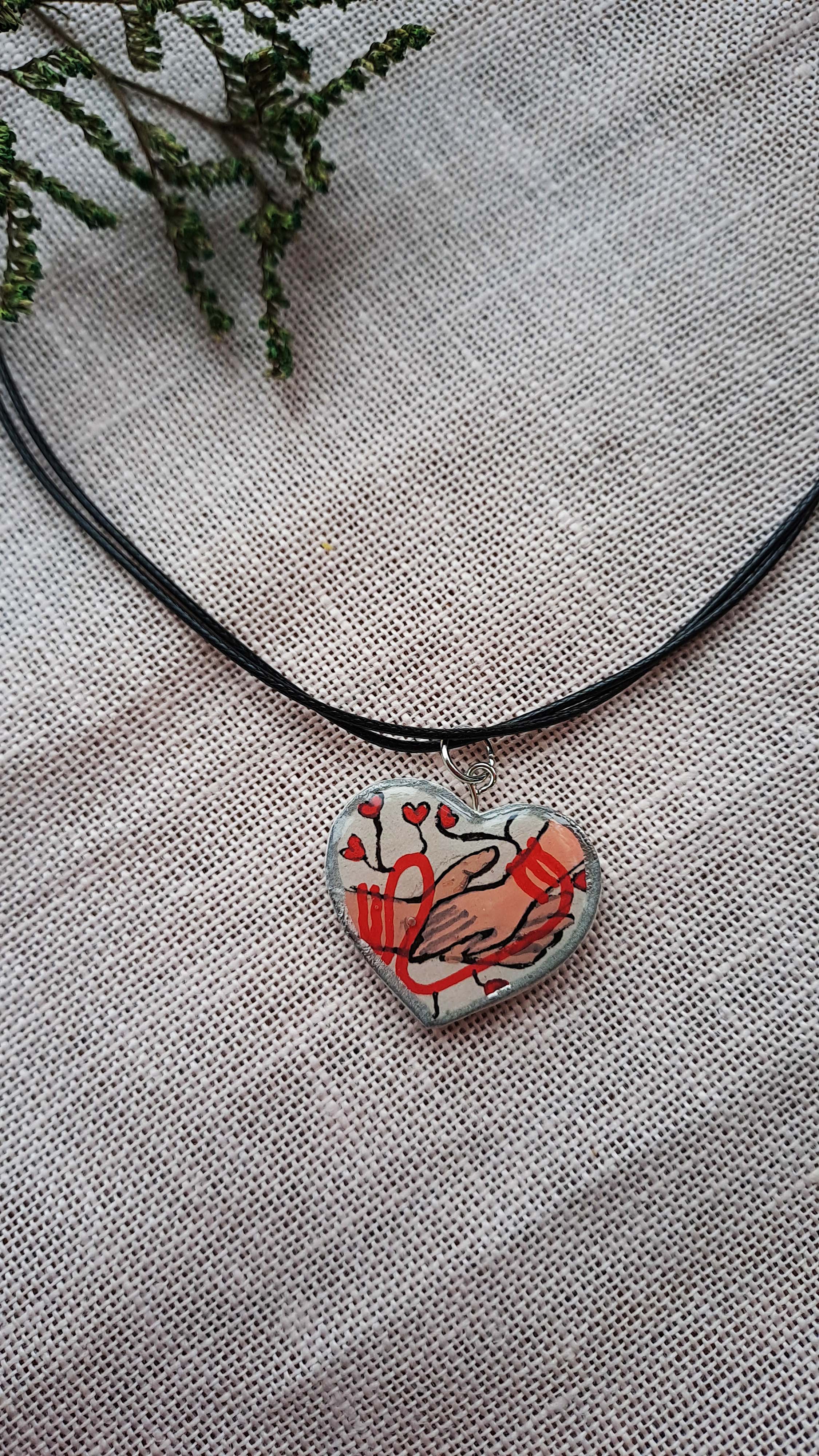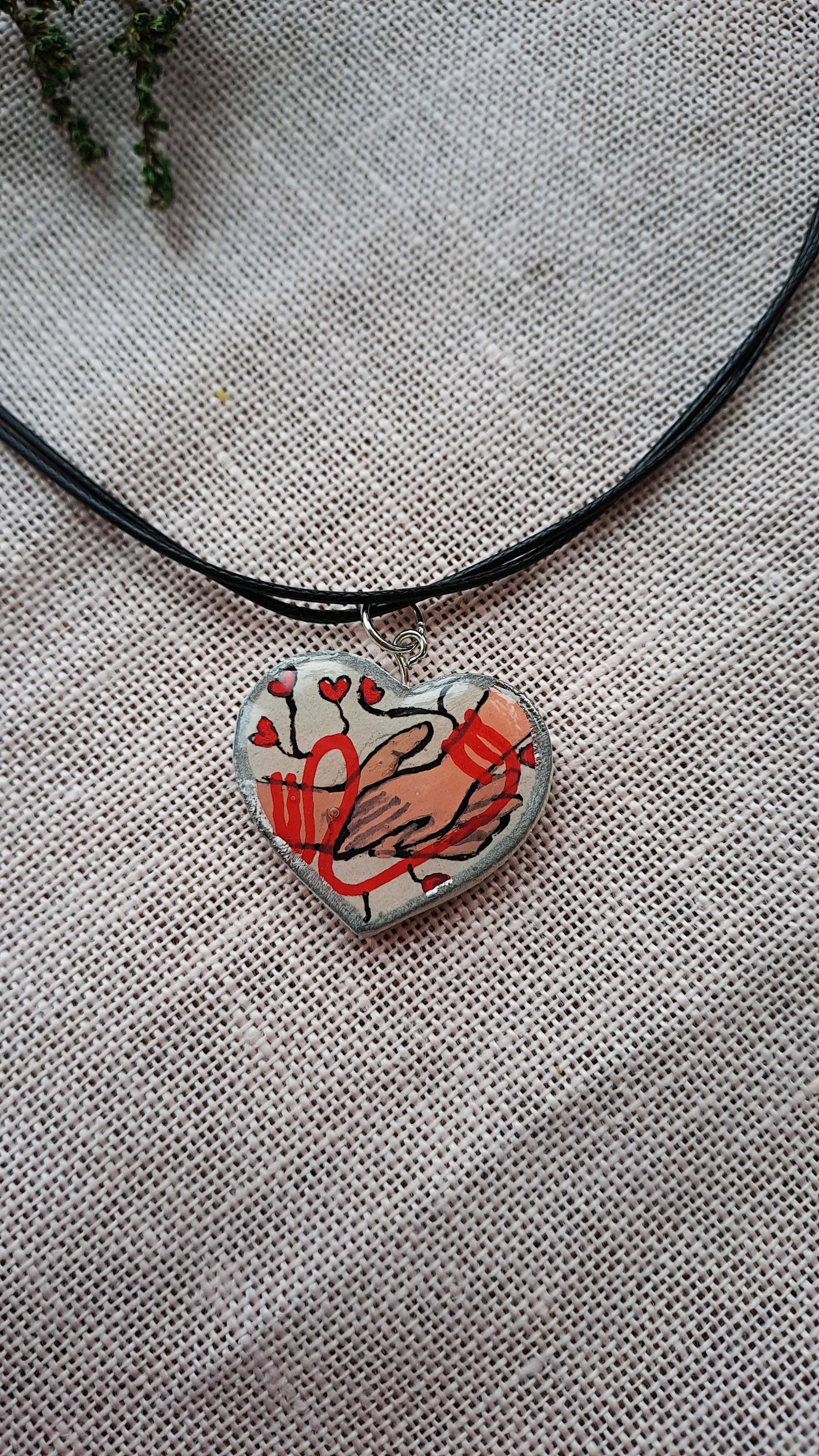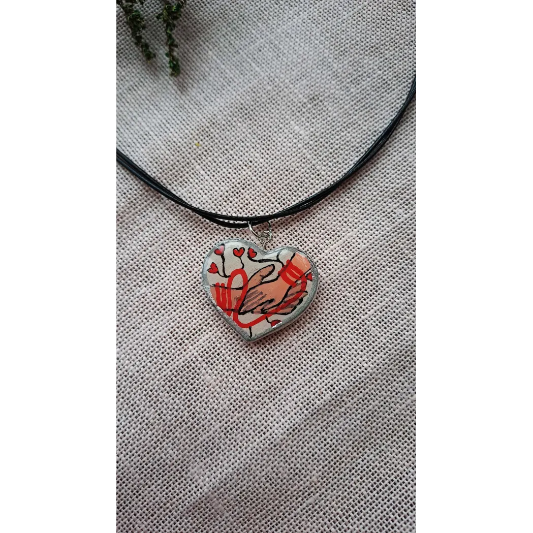 Colier cu pandantiv din lut pictat manual și apoi încastrat în rășină, pe șnur cerat, reglabil.