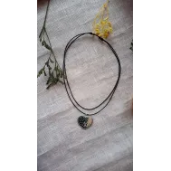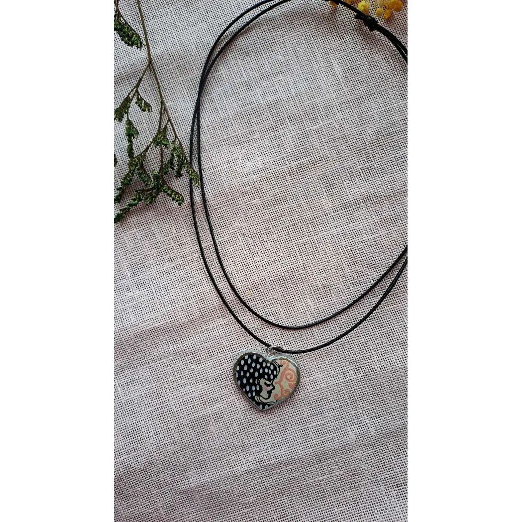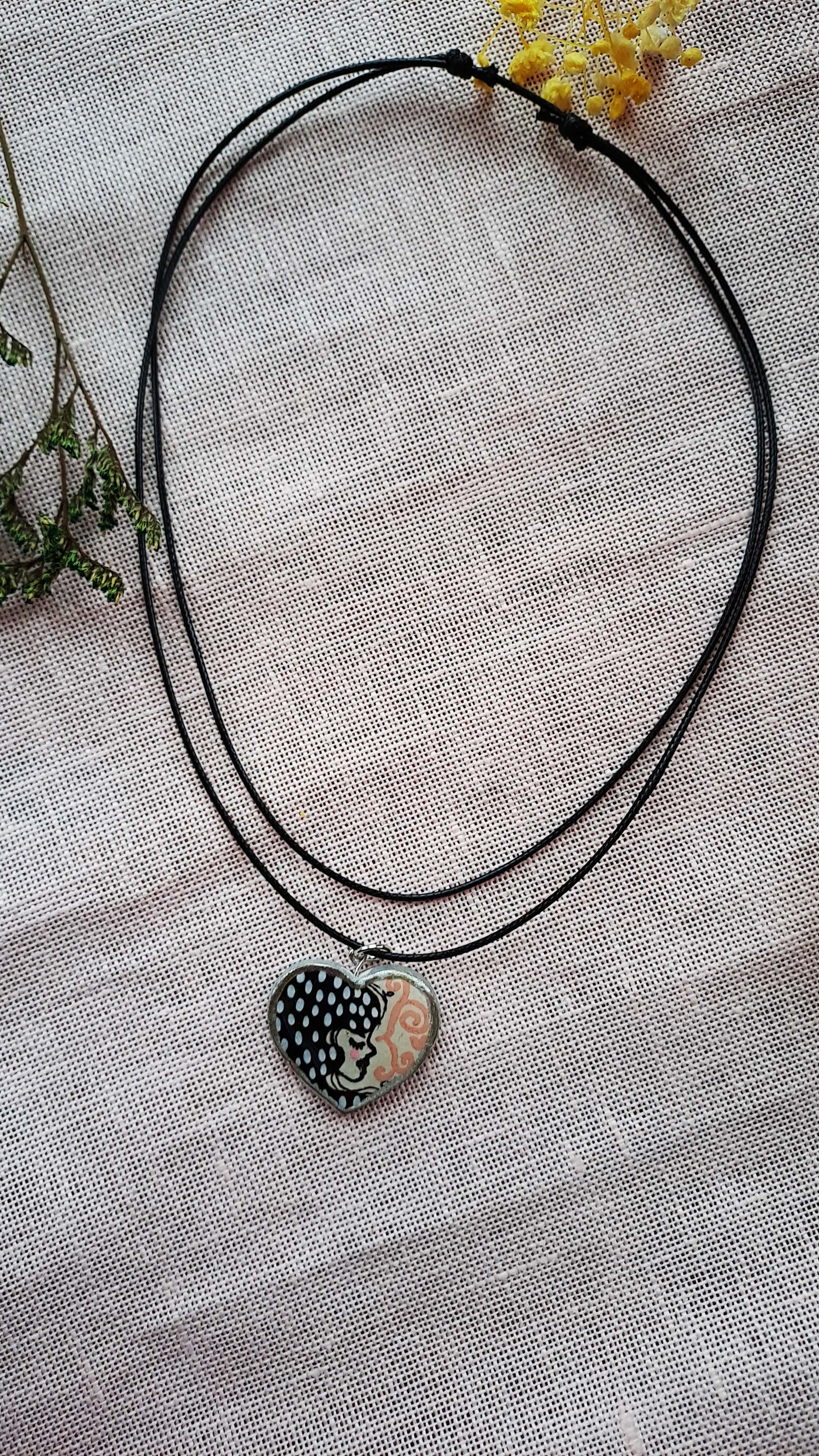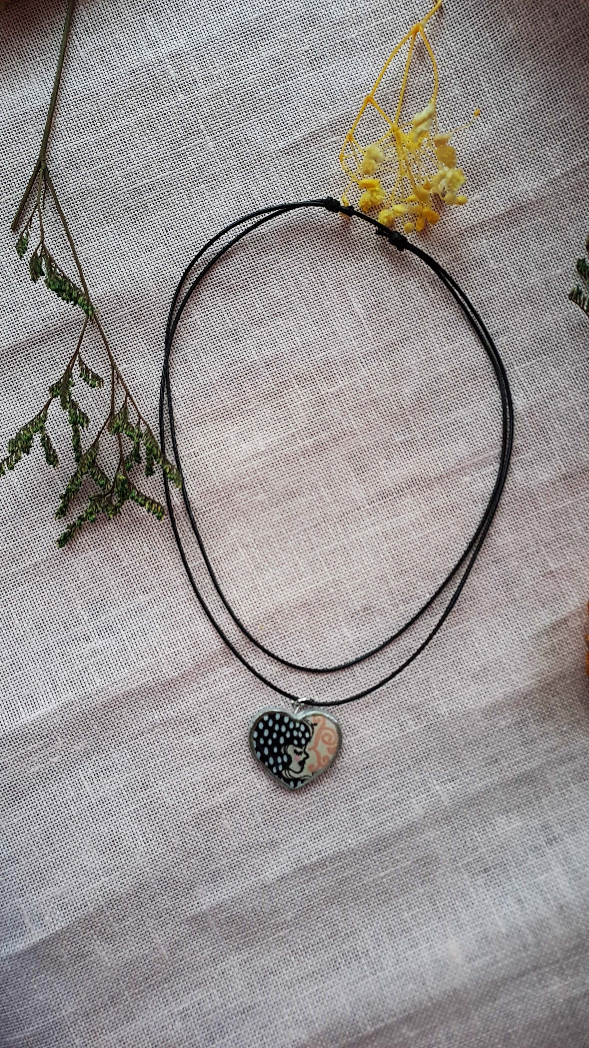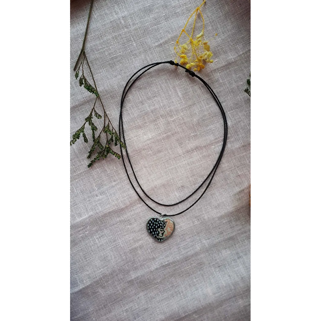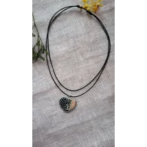 Colier cu pandantiv din lut pictat manual și apoi încastrat în rășină, pe șnur cerat, reglabil.