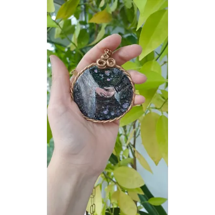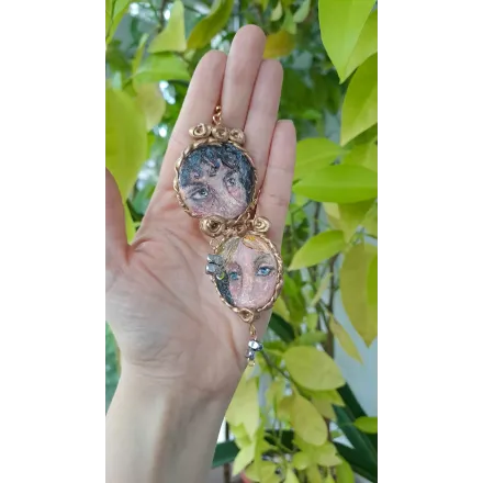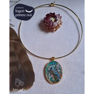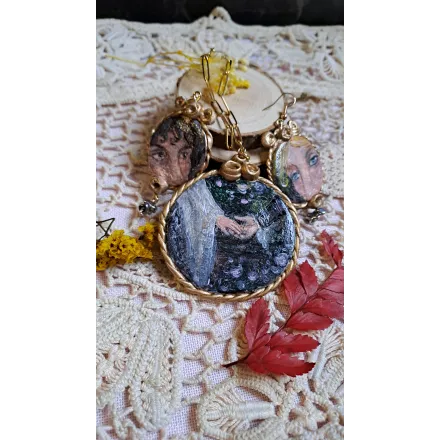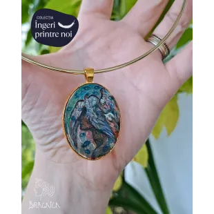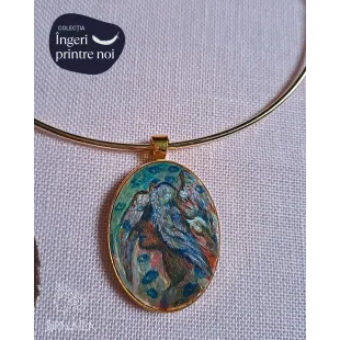 Colier cu pandantiv din lut polimeric incastrat, apoi pictat manual cu vopsele acrilice. O pictura miniaturala gata de a fi purtata. Accesorii din otel inoxidabil.