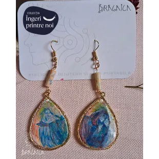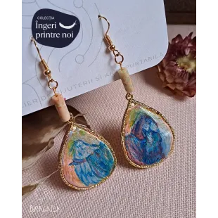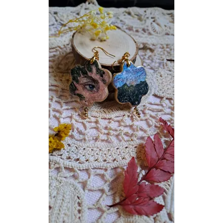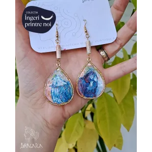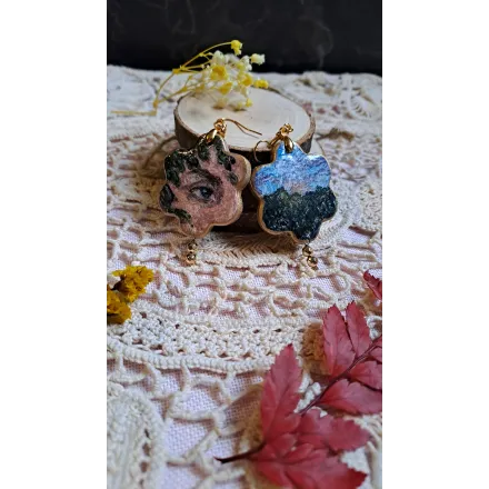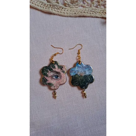 Cercei din lut polimeric, realizați manual, apoi pictati cu vopsele acrilice. Mici picturi miniaturale gata de a fi purtate si adorate. Accesorii din otel inoxidabil și pietre semiprețioase.
