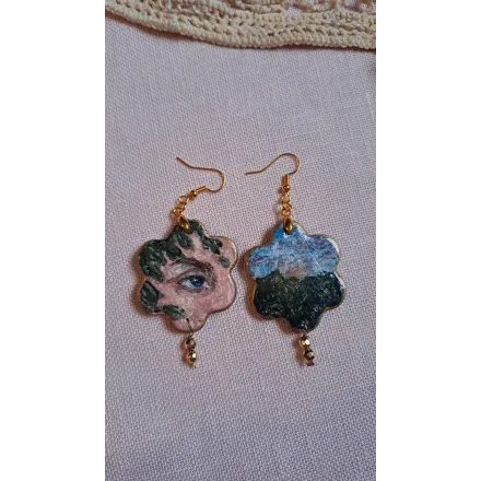 O privire înăuntru, spre sine. Cercei realizați din lut polimeric, pictați manual cu vopsele acrilice, cu accesorii din oțel inoxidabil și cateva pietre din hematit fațetat.