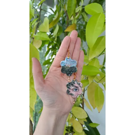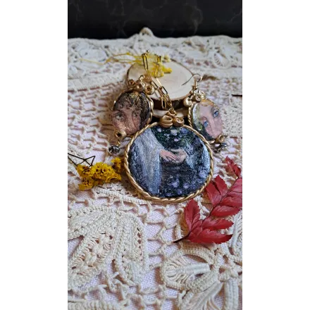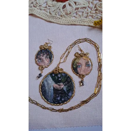 O întâlnire secretă, șoapte auzite târziu în noapte și priviri pline de sens. Set format din colier cu pandantiv si cercei, realizați din lut polimeric. Pictate manual, cu accesorii din oțel inoxidabil, iar cerceii au și cateva pietre din hematit.