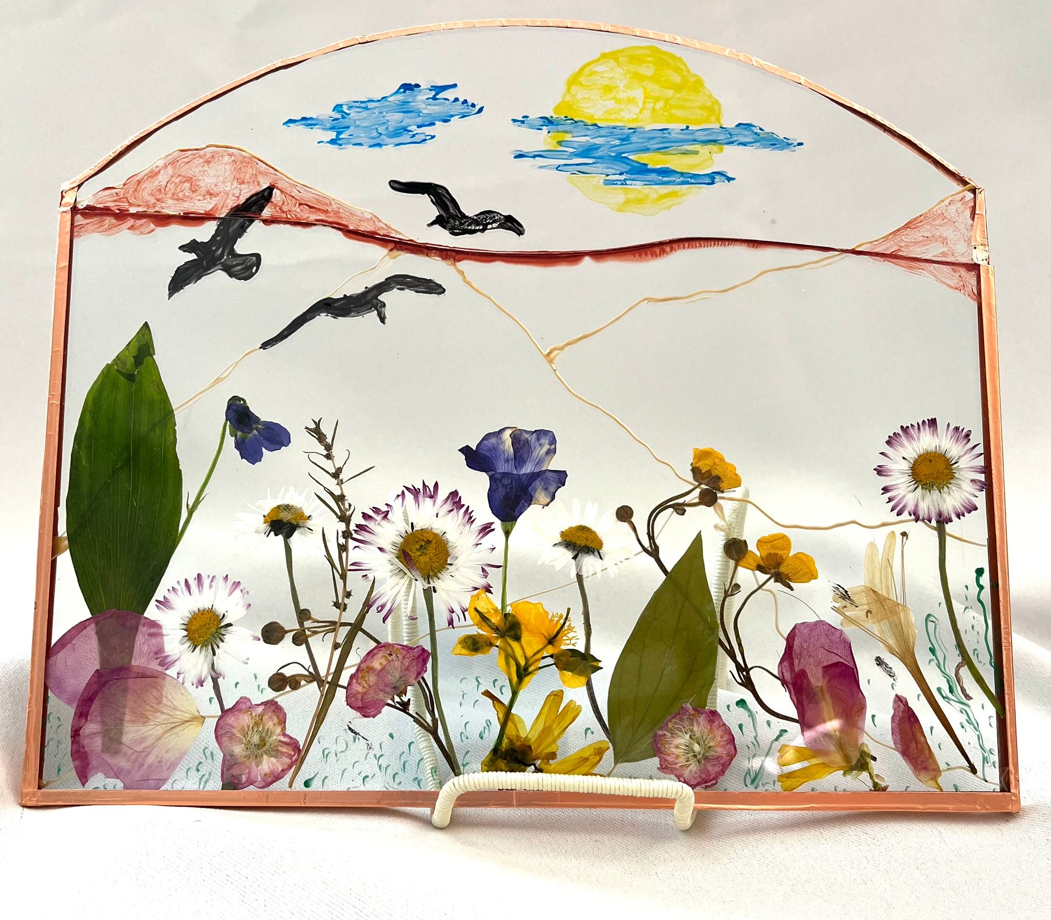 Tablou cu flori naturale presate, pozitionate intre doua folii de sticla , inchise cu banda de cupru.