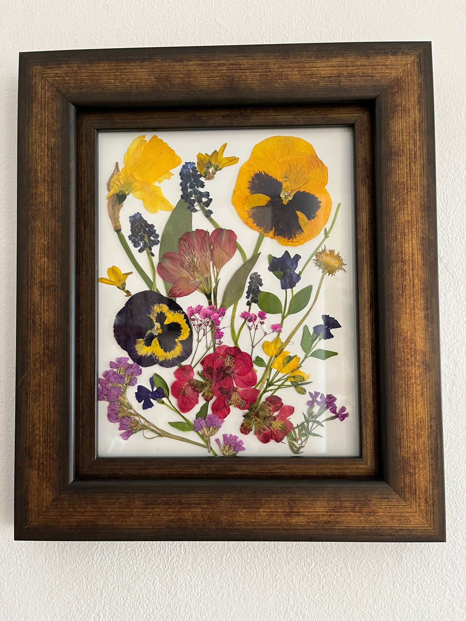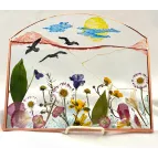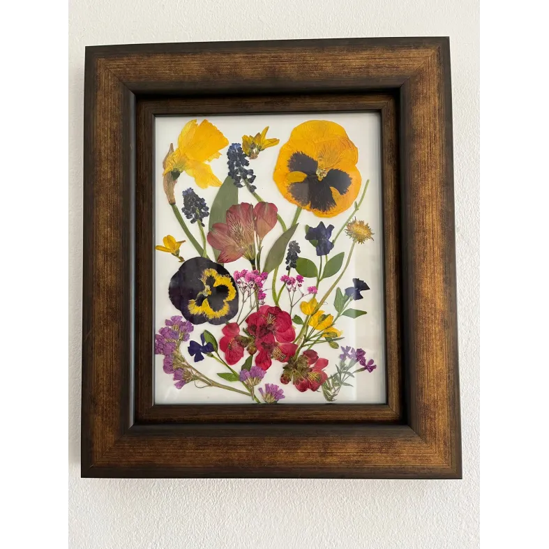 Tablou cu flori naturale presate, pozitionate intre doua folii de sticla , și cu rama lemn.