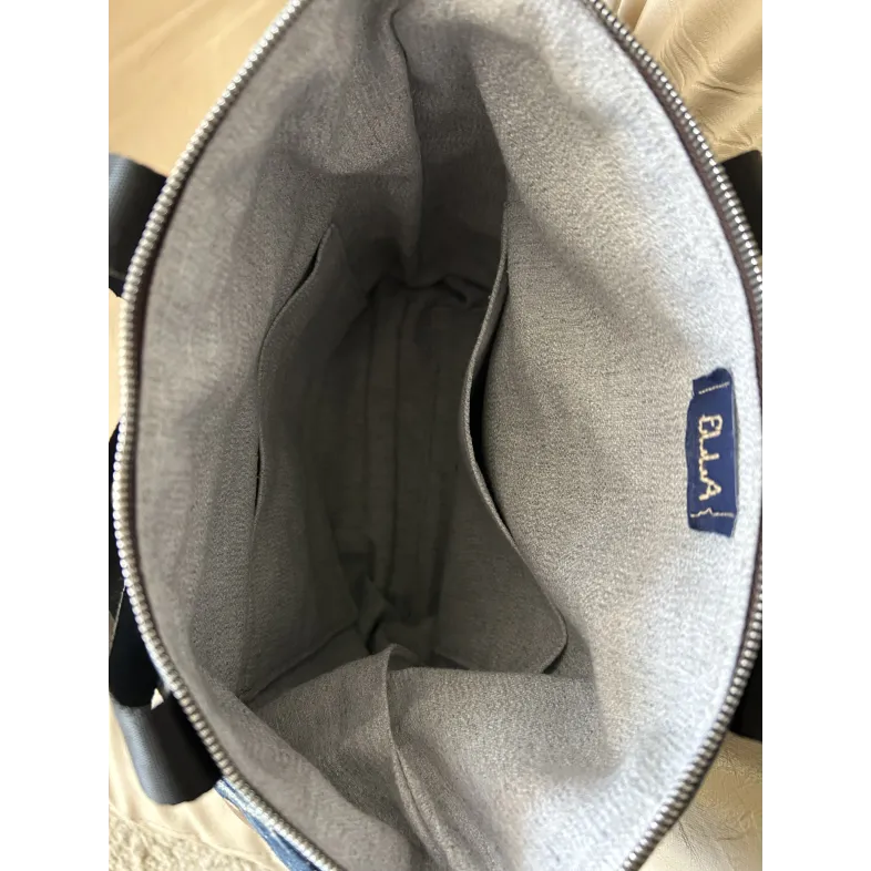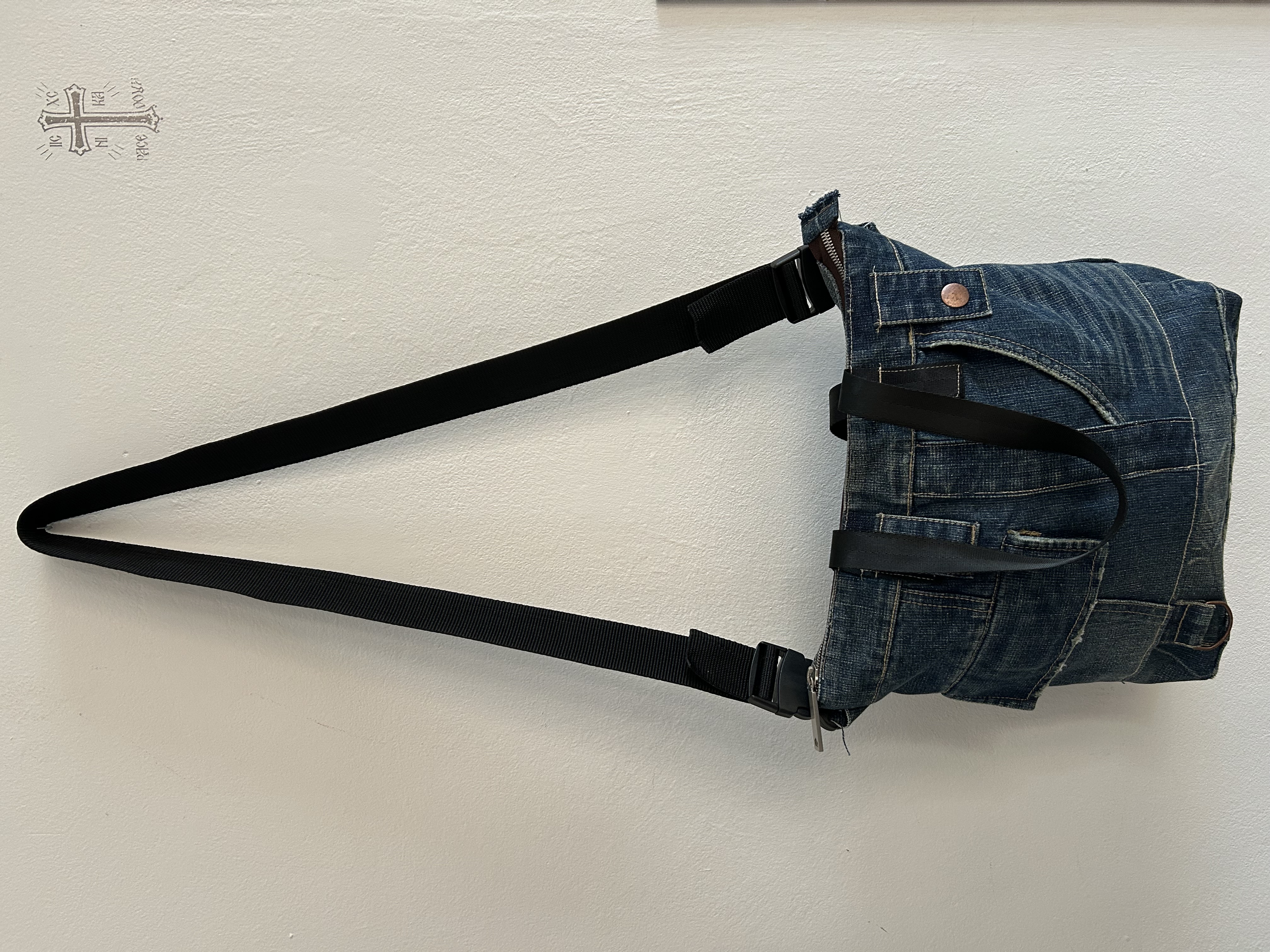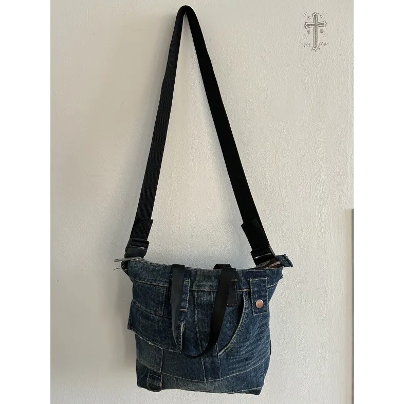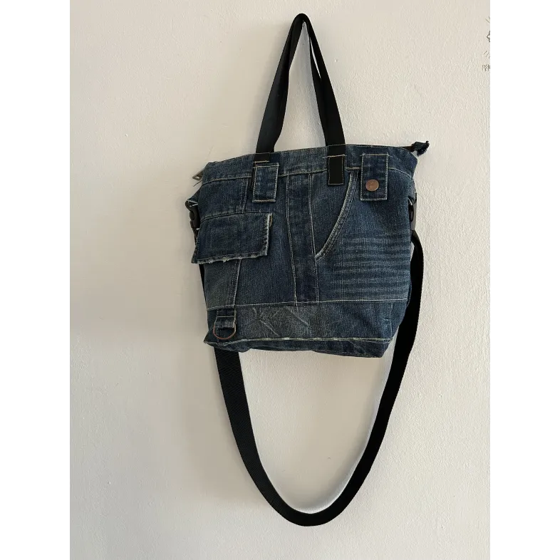Geantă material denim 32*30*7 ,cu buzunar exterior si doua buzunare in interior.  Practică, având două mânere scurte de aproximativ 20 centimetri pentru purtarea in mana și o curea de aproximativ 1,2 metri, reglabilă, pentru umăr. Potrivită pentru ținute casual sau elegante, sport, serviciu sau cumpărături.