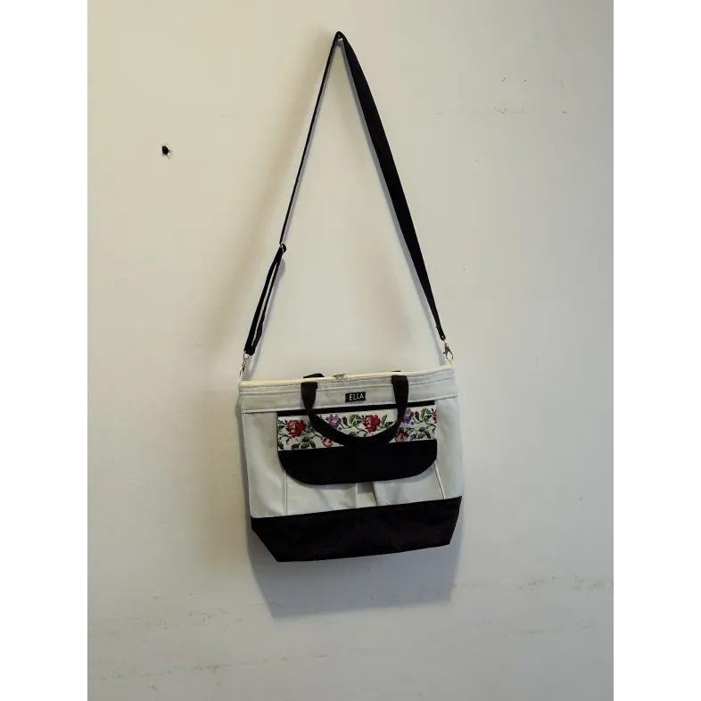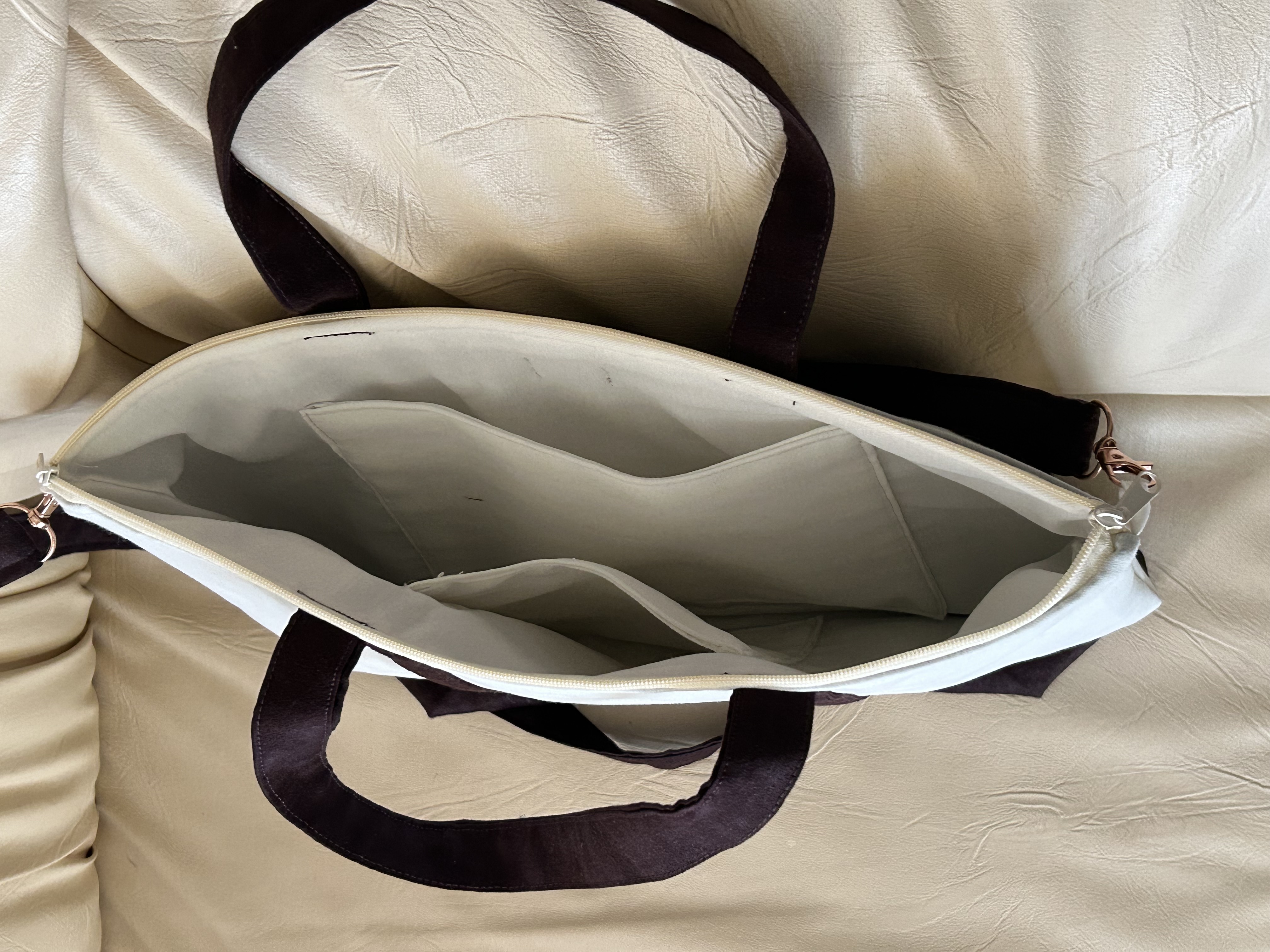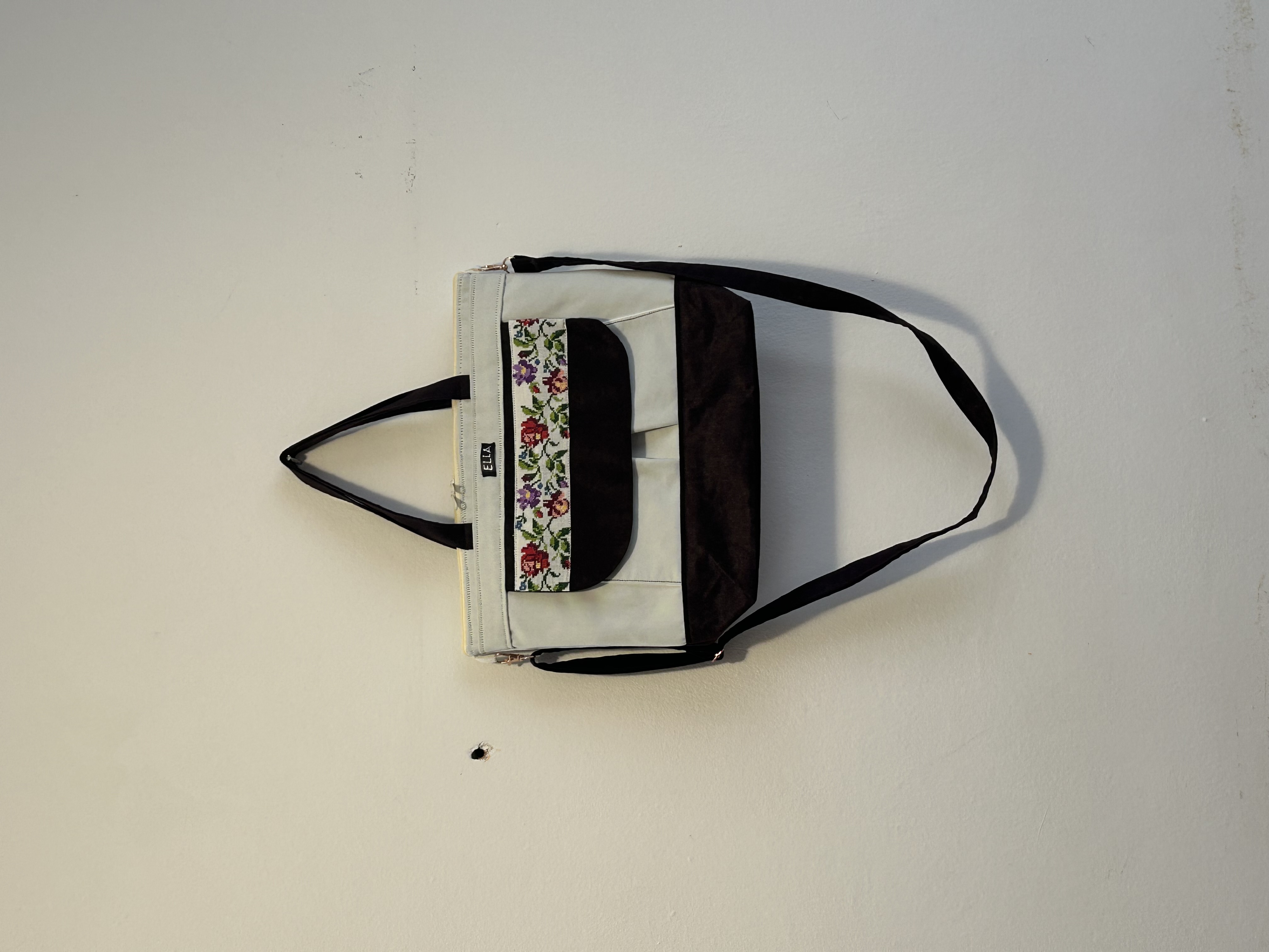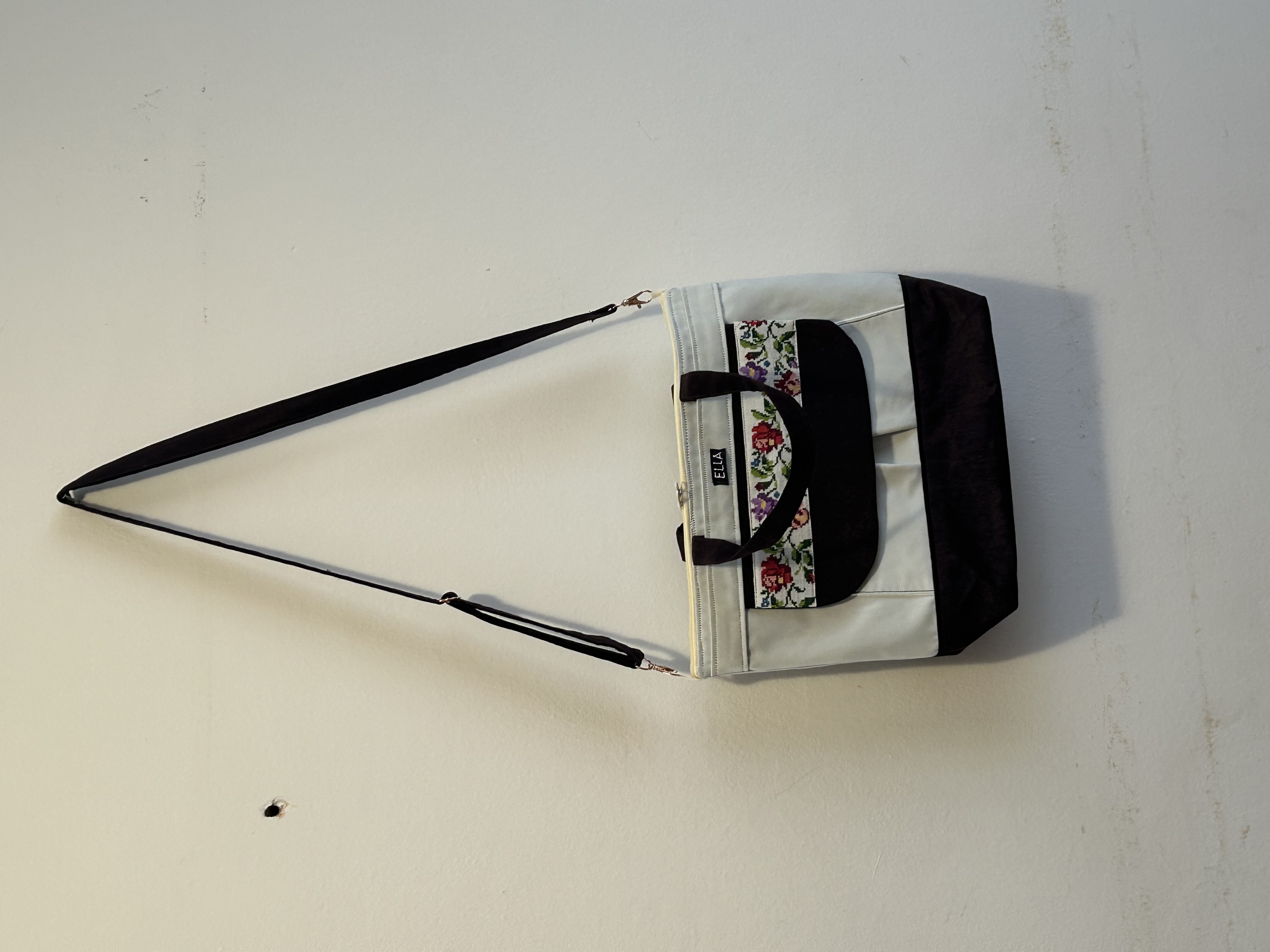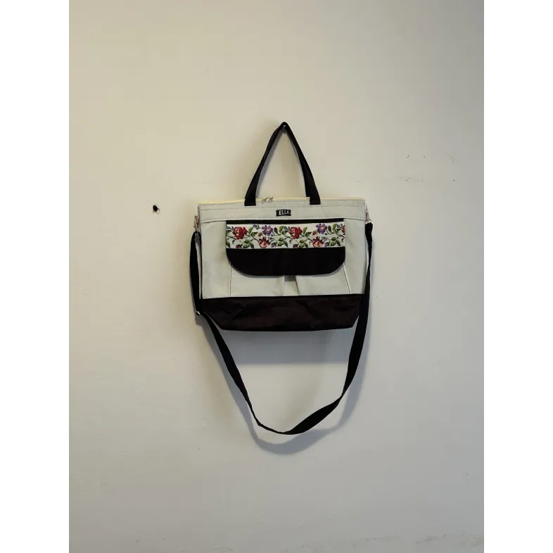 Geantă material textil 32*30*8 cu buzunare , căptușite la interior cu material textil și încheiere cu fermoar Practică, având două mânere scurte de aproximativ 20 centimetri pentru purtarea in mana și o curea de aproximativ 1,1metri, reglabilă, pentru umăr. Potrivită pentru ținute casual sau elegante, sport, serviciu sau cumpărături.