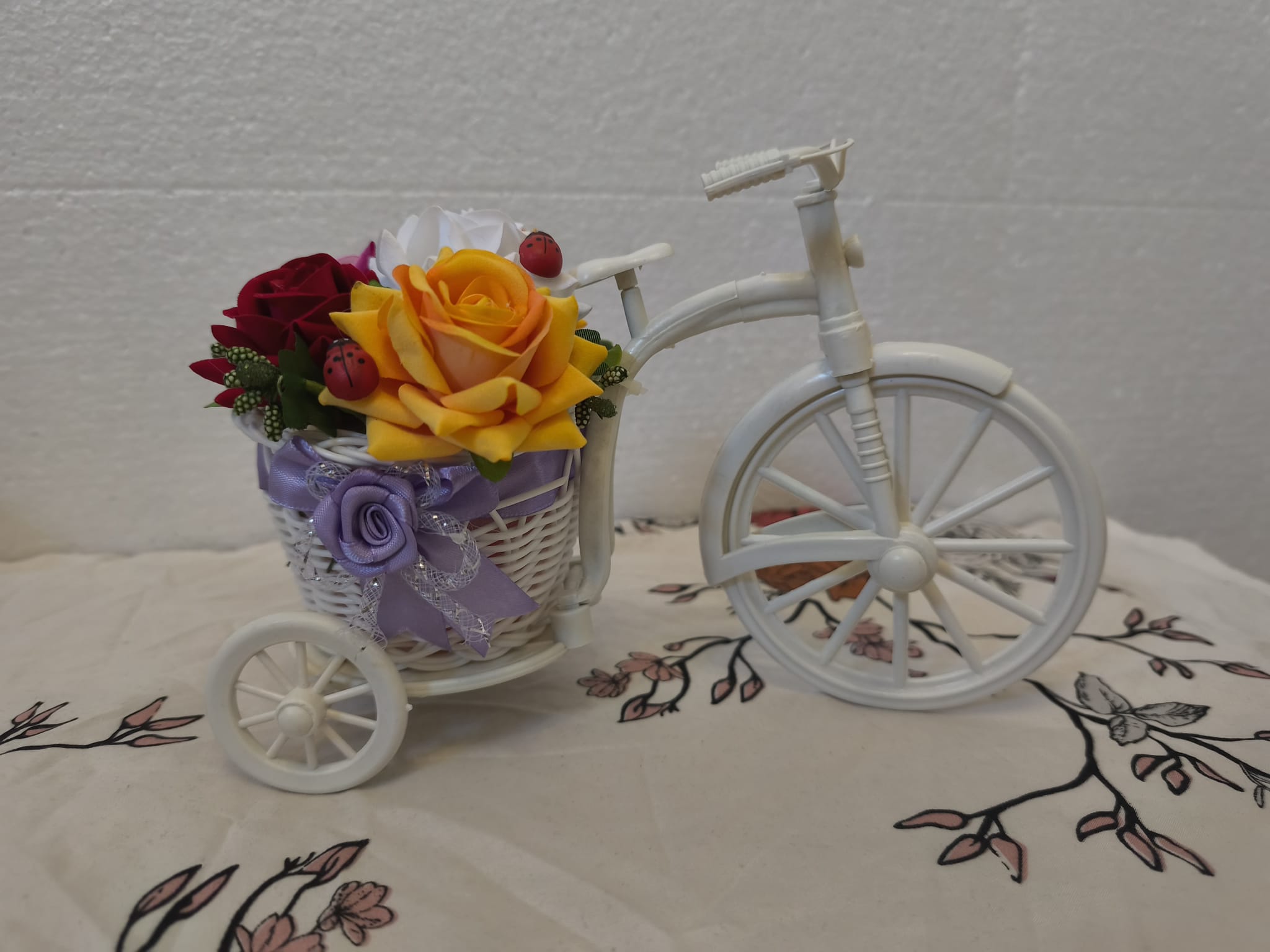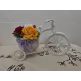 Aranjament floral cu trandafiri artificiali în coșulețul de bicicleta