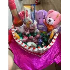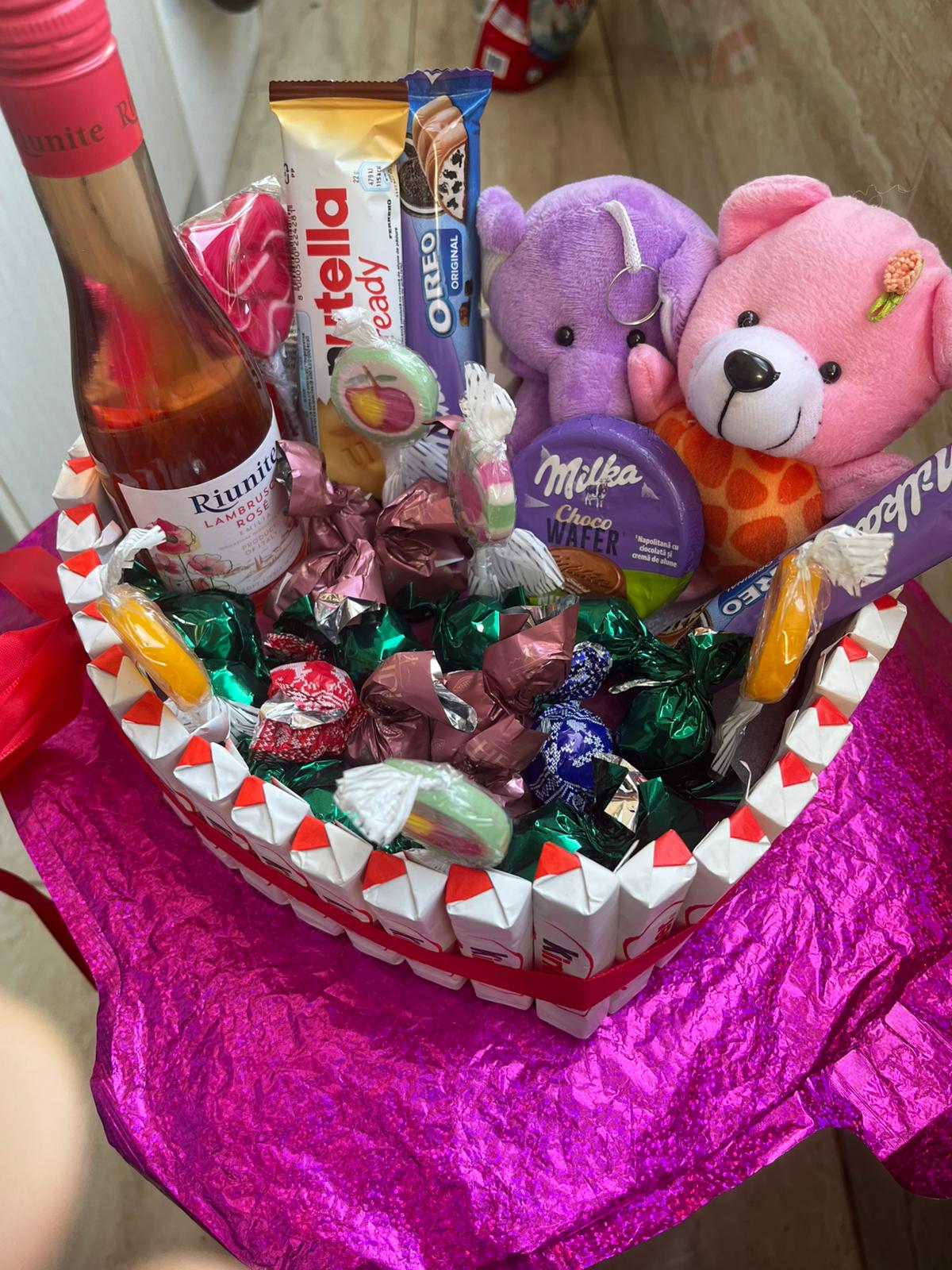 Dulce îmbrățișare este un aranjament în forma de inima creat din kinder ,umplut cu diverse sortimente de ciocolata ,2 plusuri și o sticla de vin spumant perfect pentru serile în 2