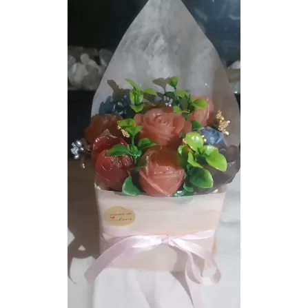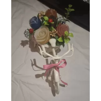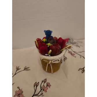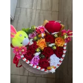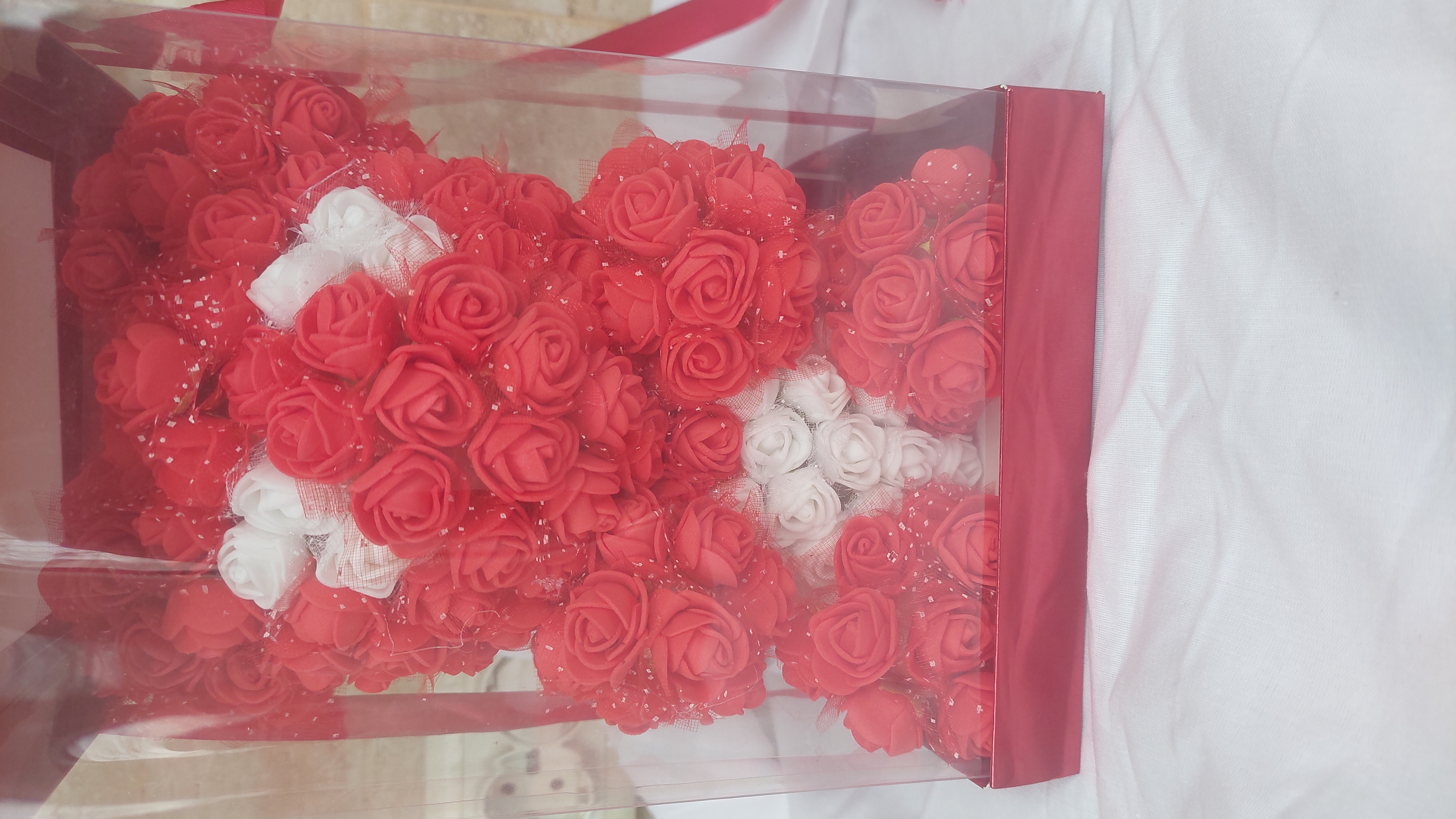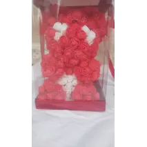 Acest ursulet este confectionat din trandafiri de spuma si vine ambalat intro cutie cu funda