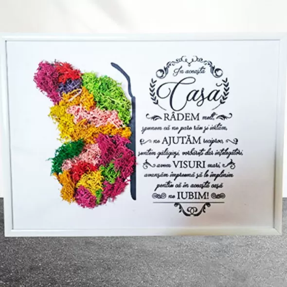 Un tablou decorativ ,cu licheni stabilizati ce poate fi aplicat pe perete sau pe birou , masa si poate schimba aspectul unei camere si cu atat mai mult daca acesta transmite un mesaj.