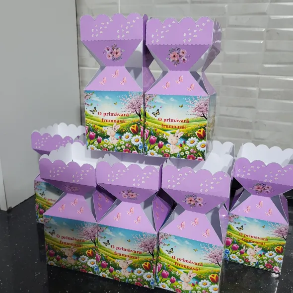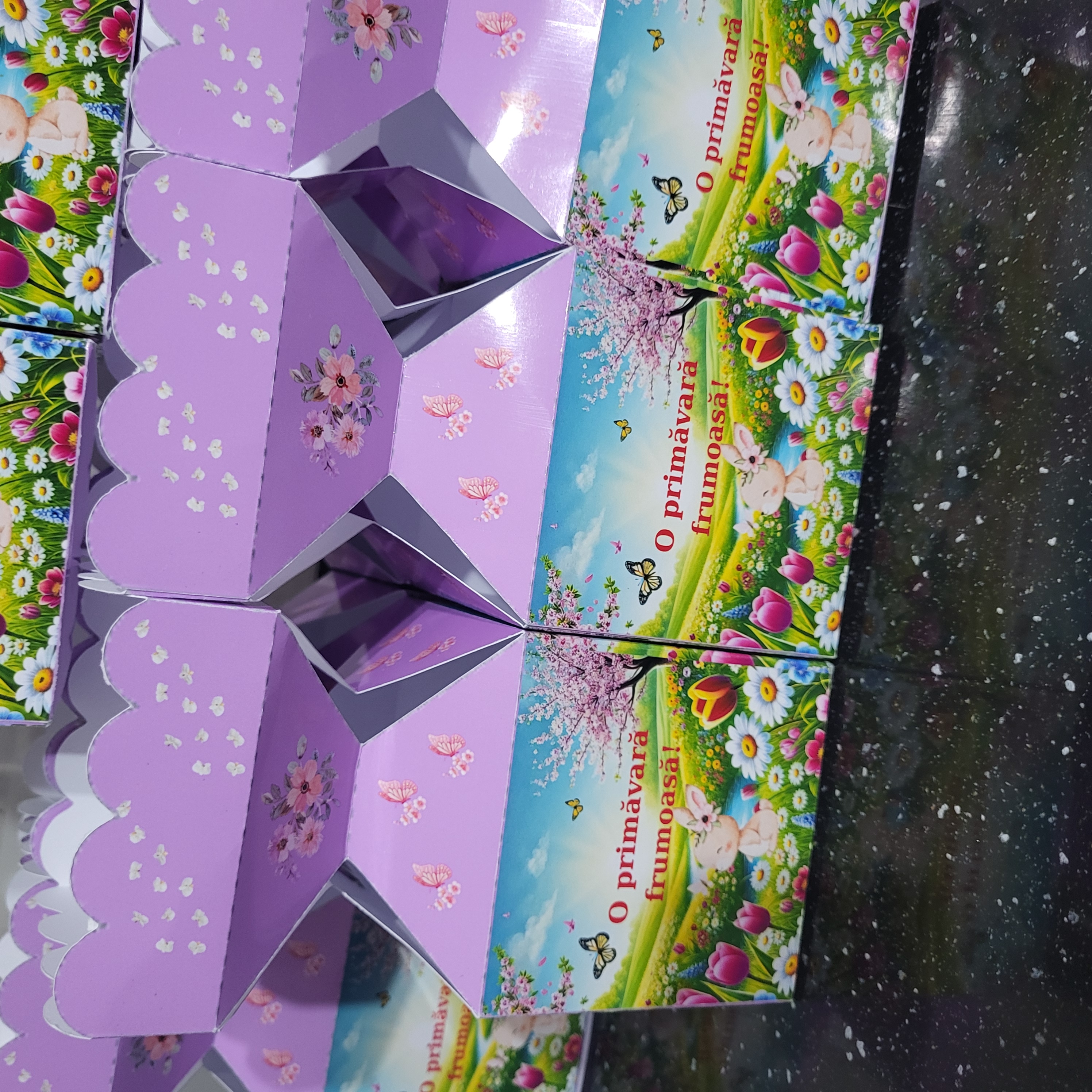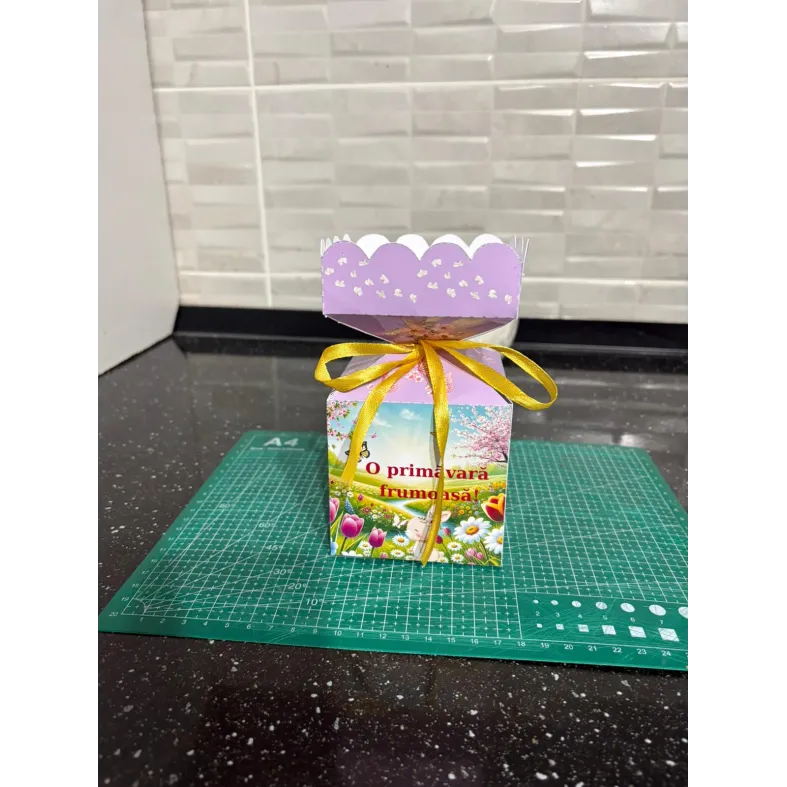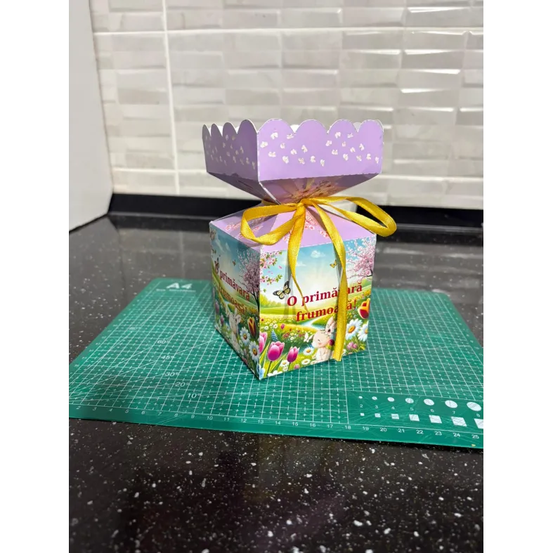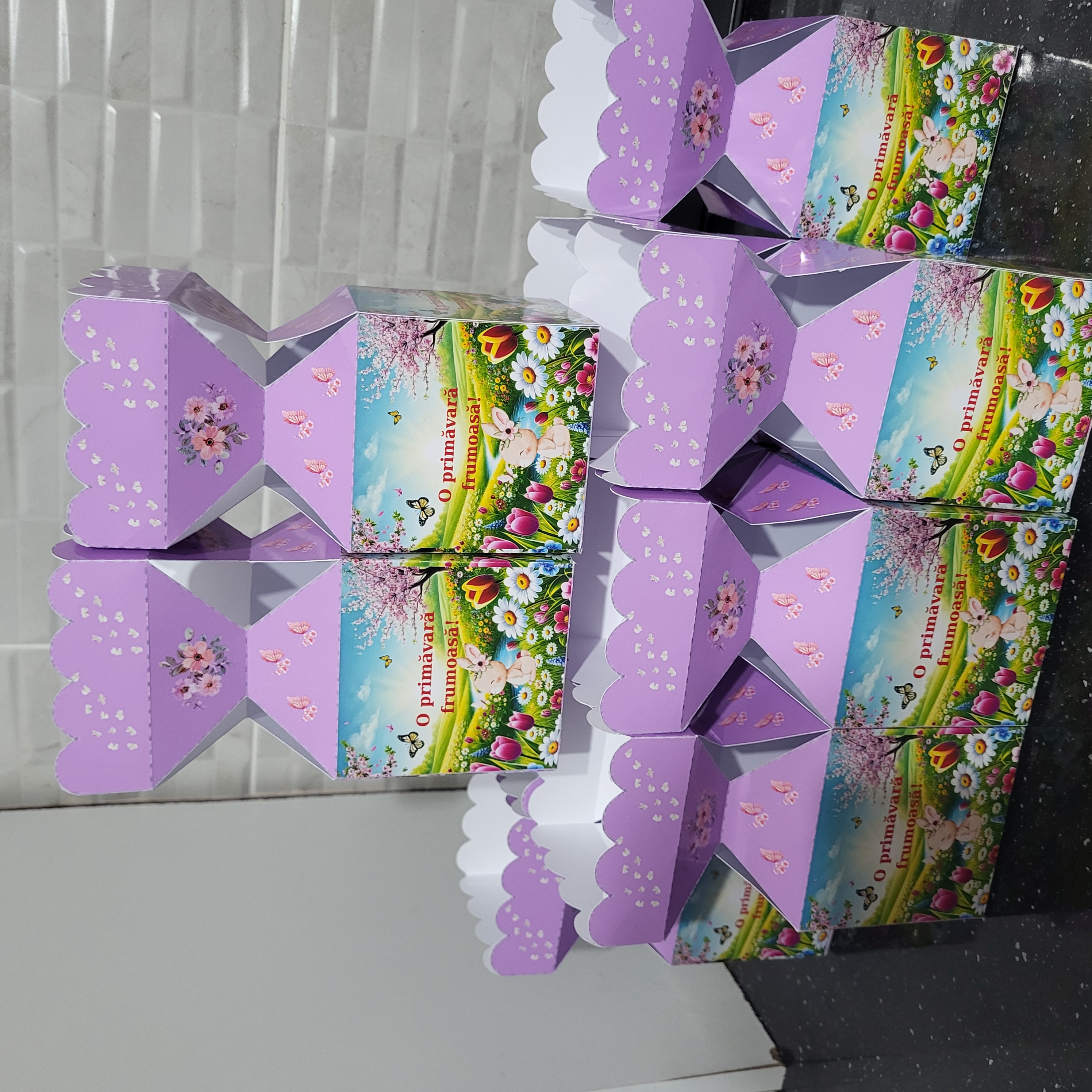 Cutiuțe din carton decorativ, cu design de primăvară (flori, fluturași și iepuraș).