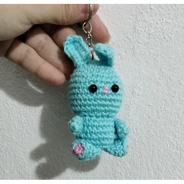 Breloc iepuras, realizat manual din bumbac mercerizat 100%, cu umplutura hipoalergenica, perfect pentru a fi oferit cadou de Paste, si nu numai.