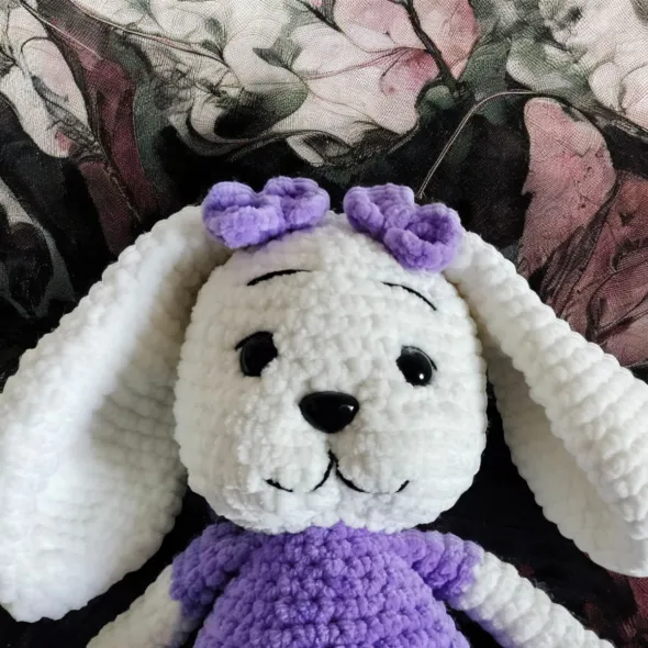 Iepuras crosetat manual, realizat din fir pufos si moale, de catifea, oferind o senzatie placuta la atingere.