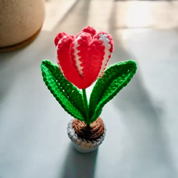 Mini lalea crosetata, in ghiveci- poate fi oferita cadou de 1 sau 8 Martie unei doamne sau domnisoare speciale, sau pur si simplu poate fi folosit ca decor pentru birou.
