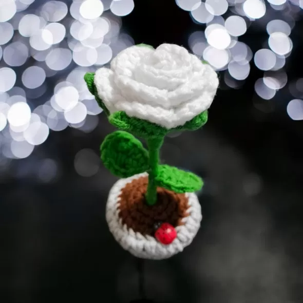 Mini trandafir crosetat, prins in ghiveci- poate fi oferit cadou de 1 sau 8 Martie unei doamne sau domnisoare speciale, sau pur si simplu poate fi folosit ca decor pentru birou.
