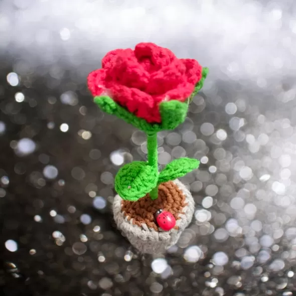 Mini trandafir crosetat, prins in ghiveci- poate fi oferit cadou de 1 sau 8 Martie unei doamne sau domnisoare speciale, sau pur si simplu poate fi folosit ca decor pentru birou.