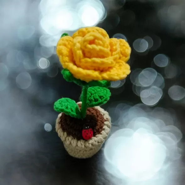 Mini trandafir crosetat, prins in ghiveci- poate fi oferit cadou de 1 sau 8 Martie unei doamne sau domnisoare speciale, sau pur si simplu poate fi folosit ca decor pentru birou.