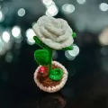 Mini trandafir crosetat, prins in ghiveci- poate fi oferit cadou de 1 sau 8 Martie unei doamne sau domnisoare speciale, sau pur si simplu poate fi folosit ca decor pentru birou.