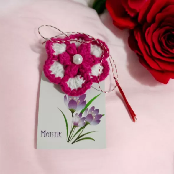 Martisor crosetat, cusut pe ac de brosa din inox.