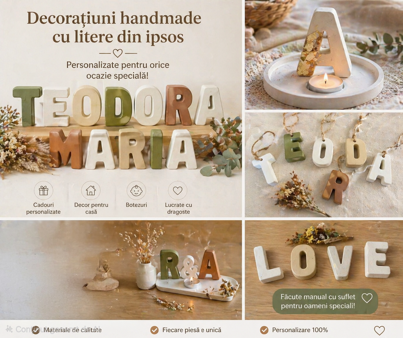 Litere din ipsos realizate manual, perfecte pentru a crea un decor unic și plin de personalitate