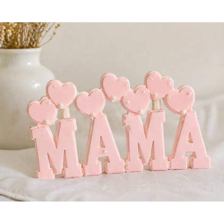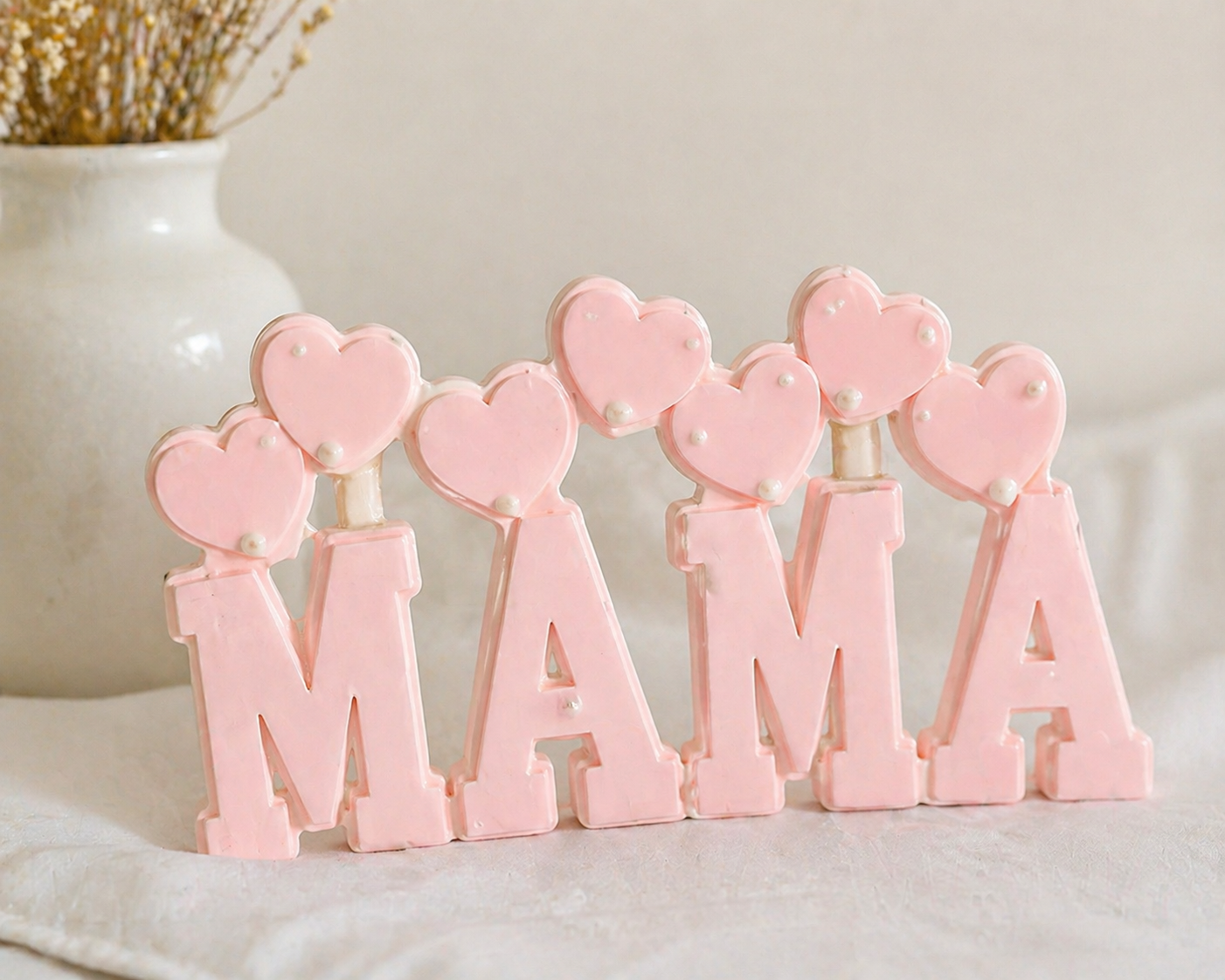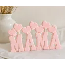 Decorațiune handmade realizată din ipsos, în formă de text „MAMA”, decorată cu inimioare, ideală pentru oferirea ca un cadou special.