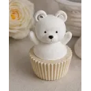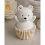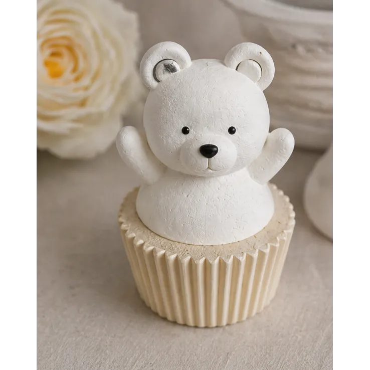 Ursuleț decorativ realizat manual din ipsos, așezat pe o bază tip cupcake, cu un design delicat și jucăuș. Perfect pentru a fi oferit cadou sau utilizat ca mărturie la evenimente speciale.