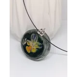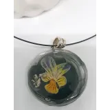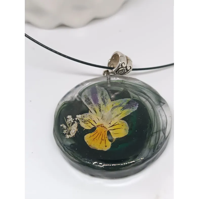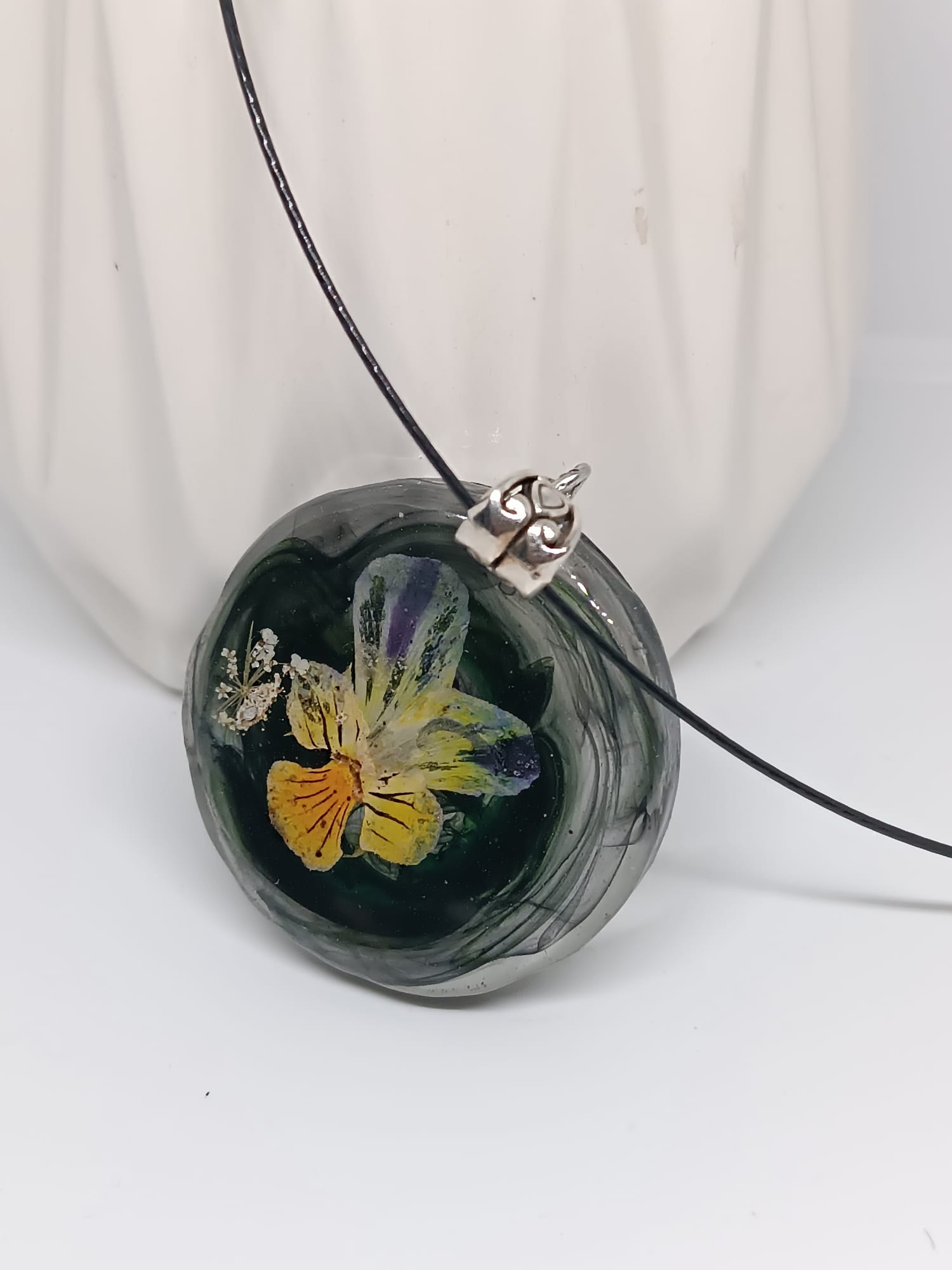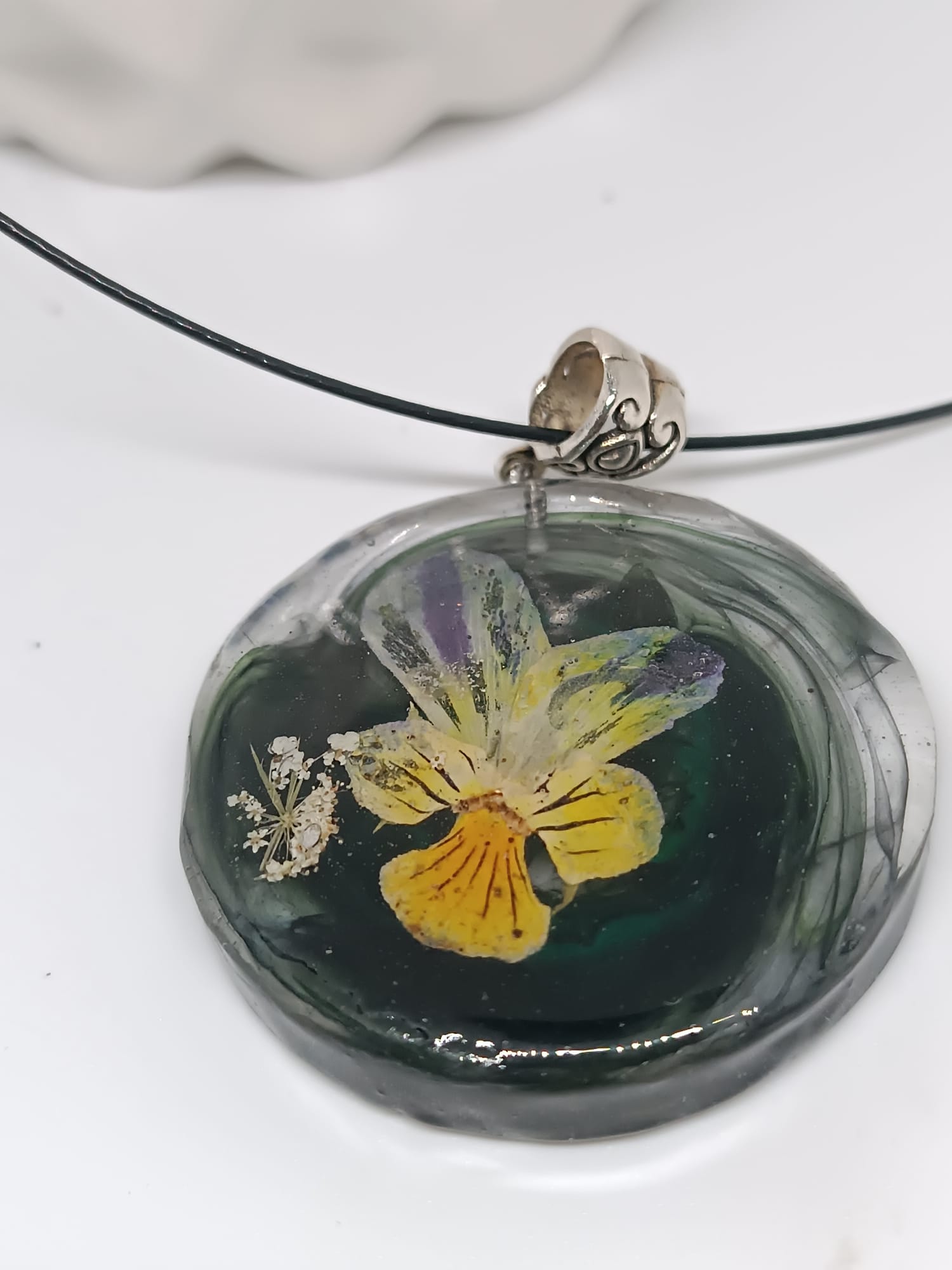 Compoziție Artistică: În centrul pandantivului se află o panseluță galben-aurie cu accente liliachii, completată delicat de flori mici de câmp (precum floarea de morcov sălbatic), creând un peisaj miniatural plin de viață.