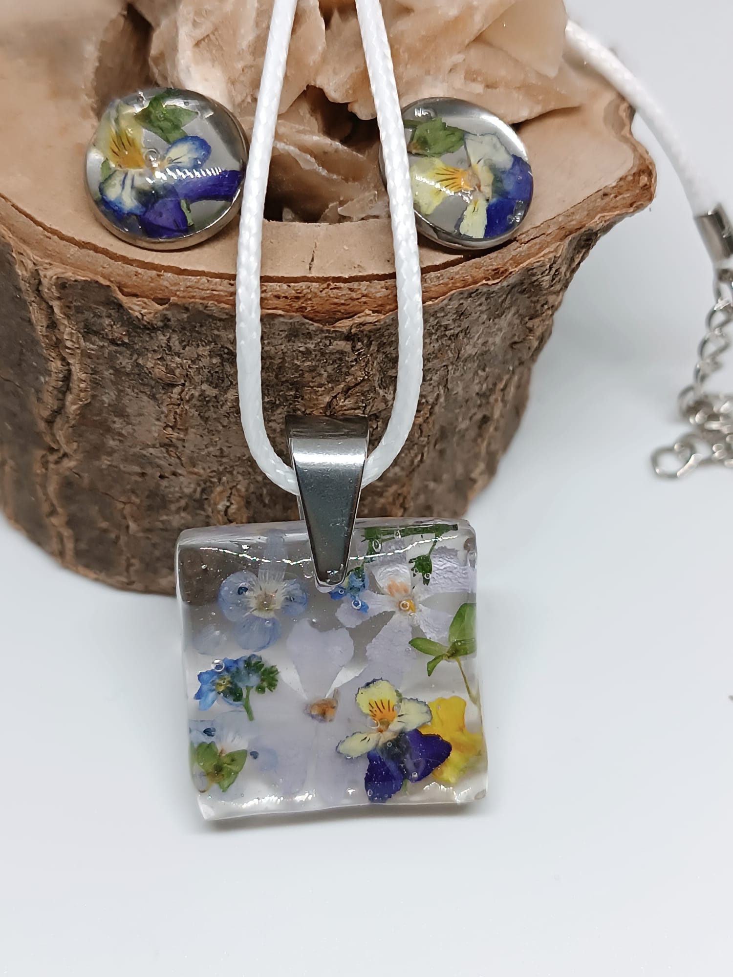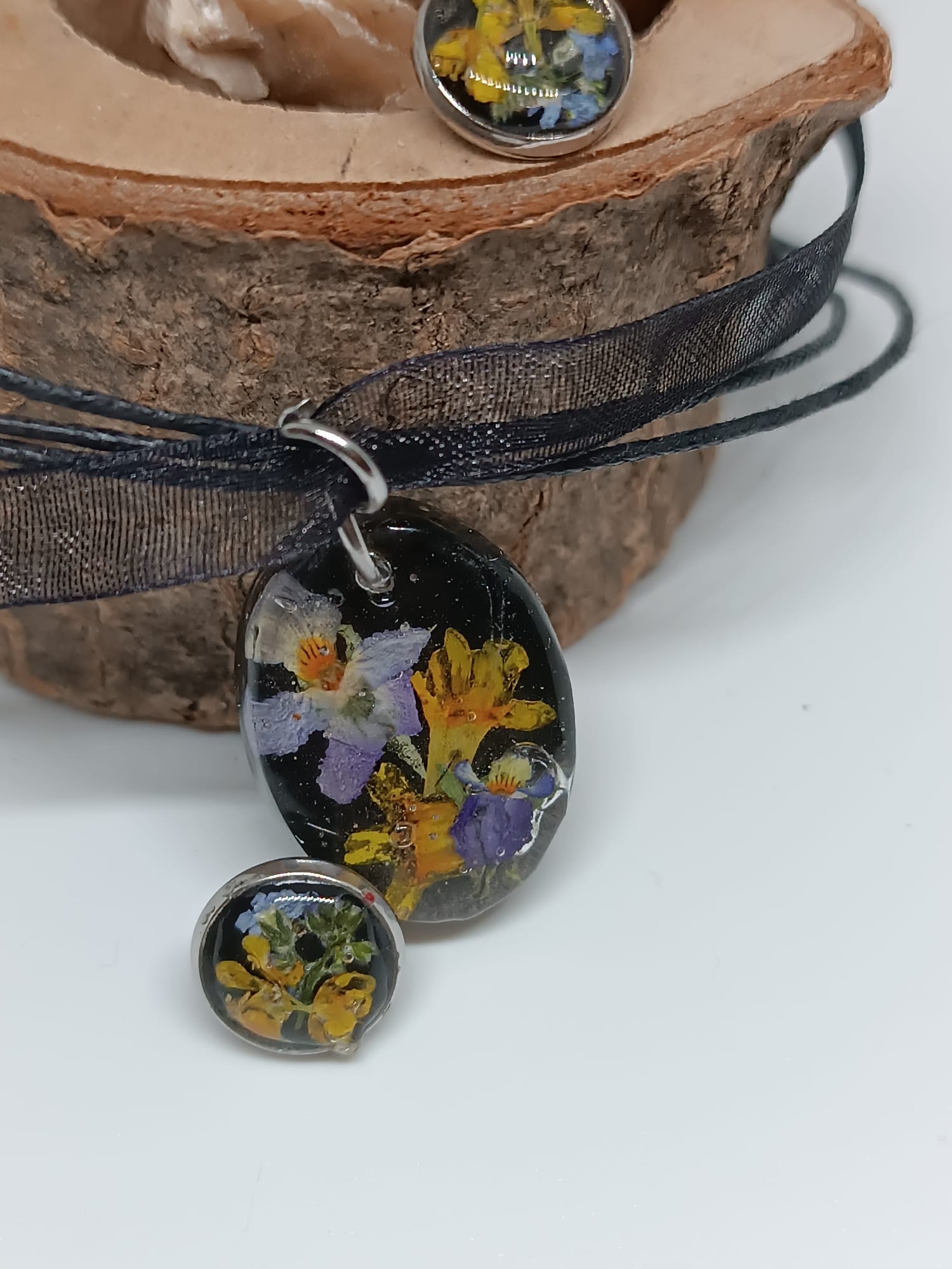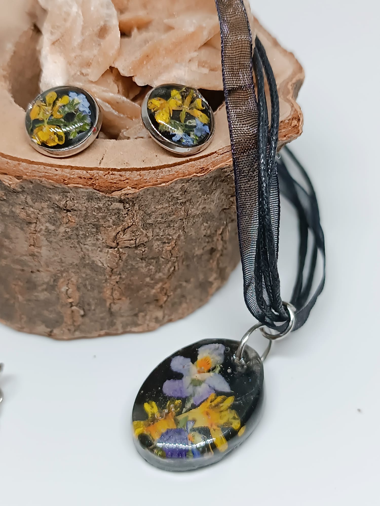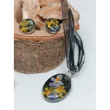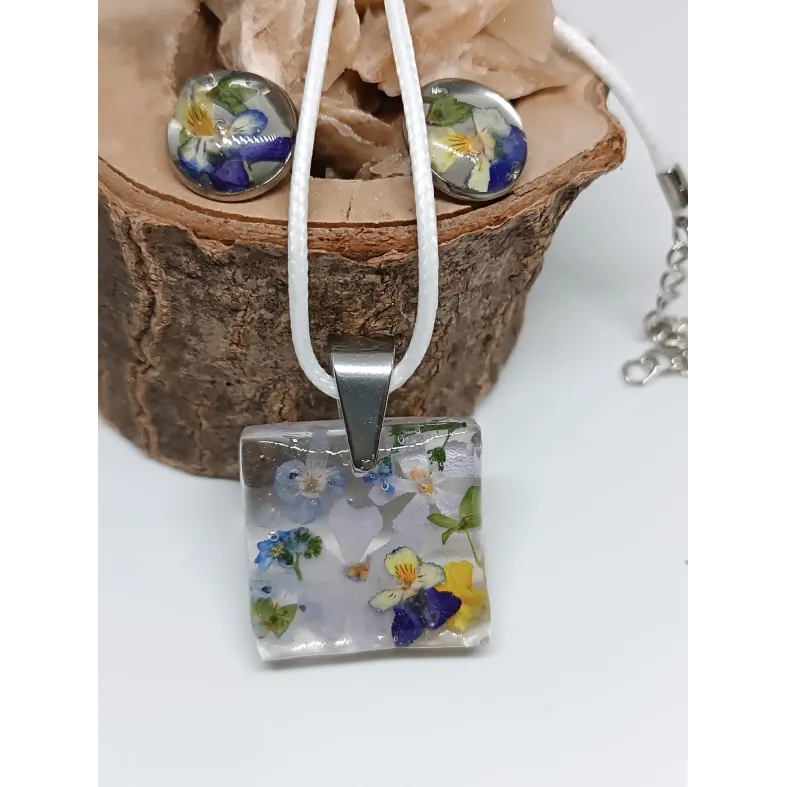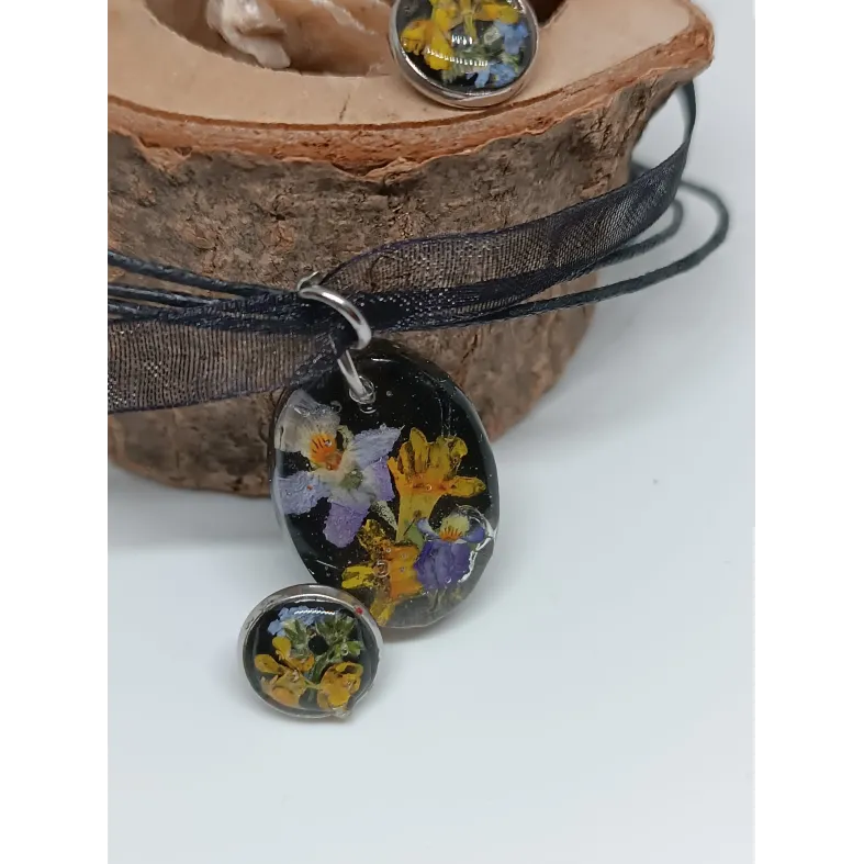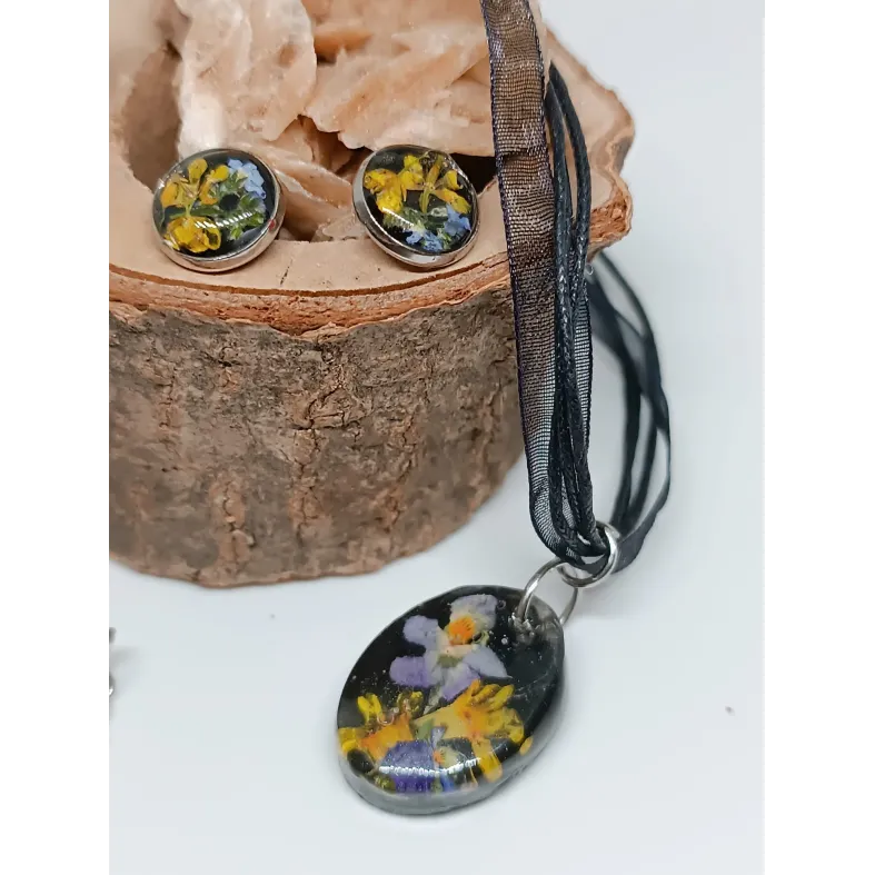 Materiale: Flori de câmp naturale și rășină epoxidică. Cerceii au un suport din oțel inoxidabil de foarte bună calitate, iar pandantivul este suspendat pe un șnur de bumbac/organza.