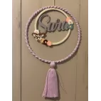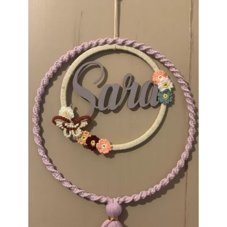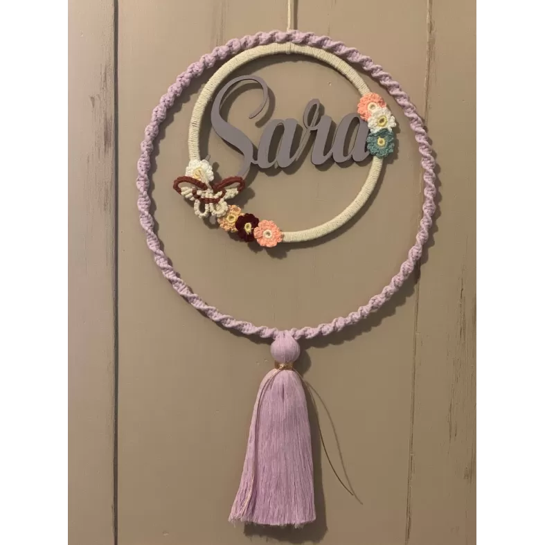 Coroniță personalizată pentru camera copilului (perete sau usa de intrare) realizată manual, din snur de macrame impletit pe un cerc metalic cu diametrul de 30cm si un cerc din lemn de 20 cm. Un decor unic, cu un design minimalist, ce adaugă un strop de farmec și căldură spațiului copilului tău. Poate fi personalizată cu orice nume sau elemente decorative preferate!