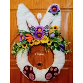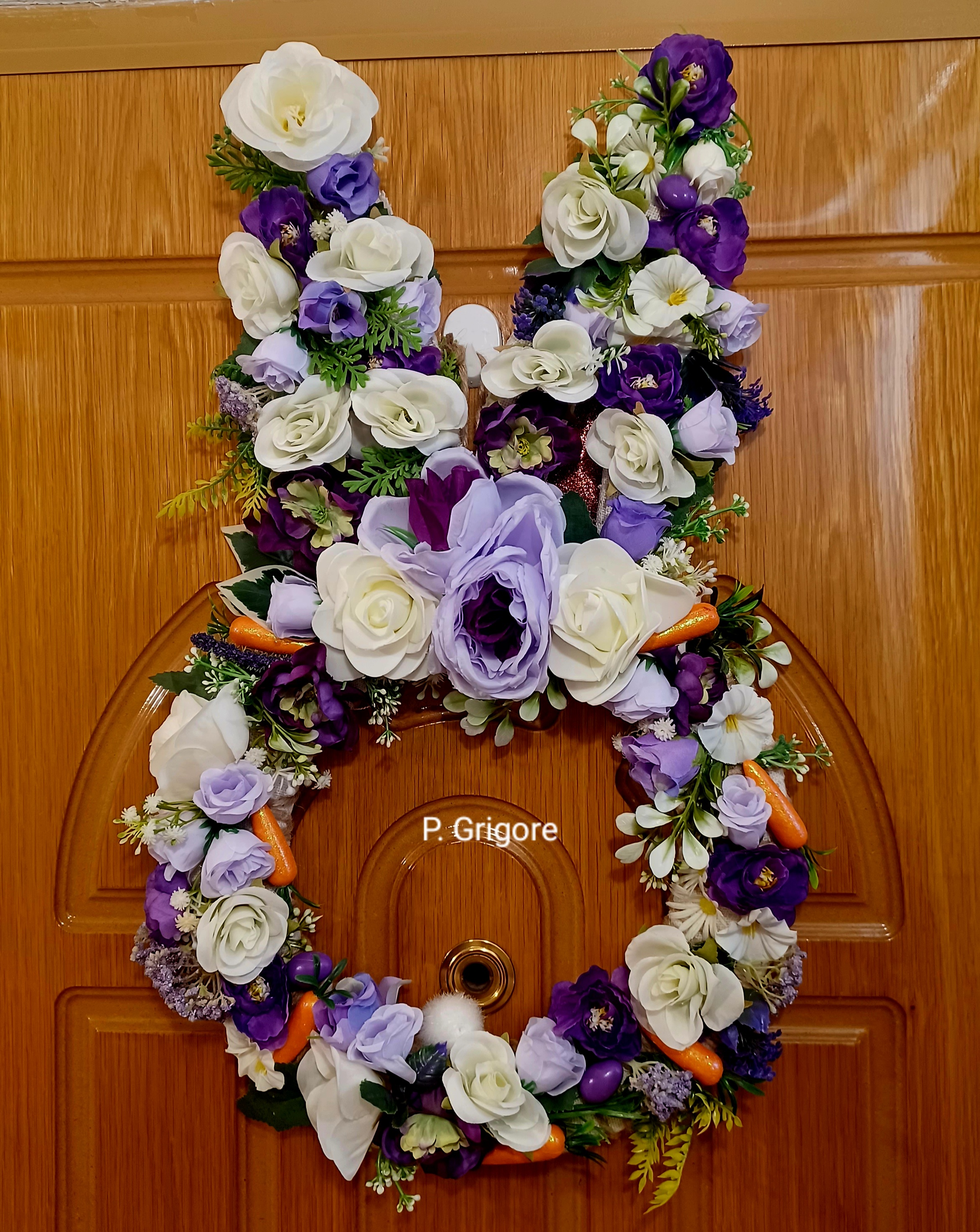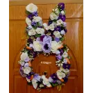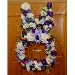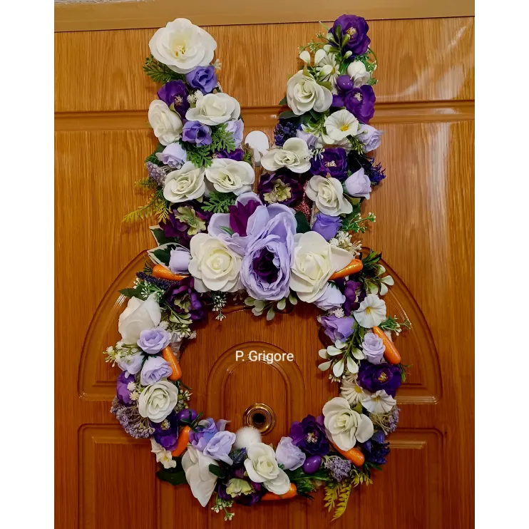 Aranjament ușă iepuraș pe suport cu flori artificiale, 55 cm înălțime, se pregătește pentru cei dragi!