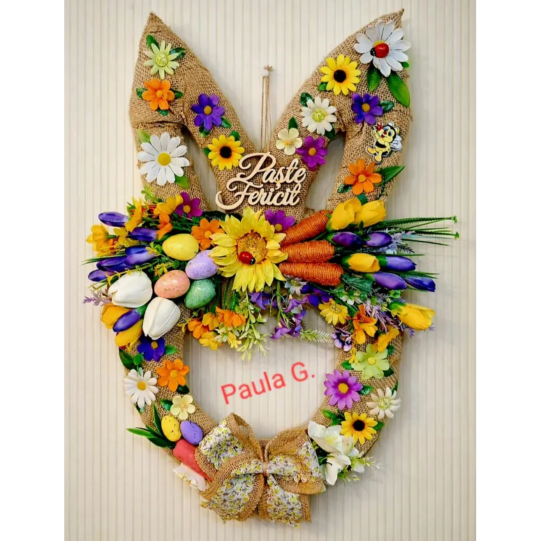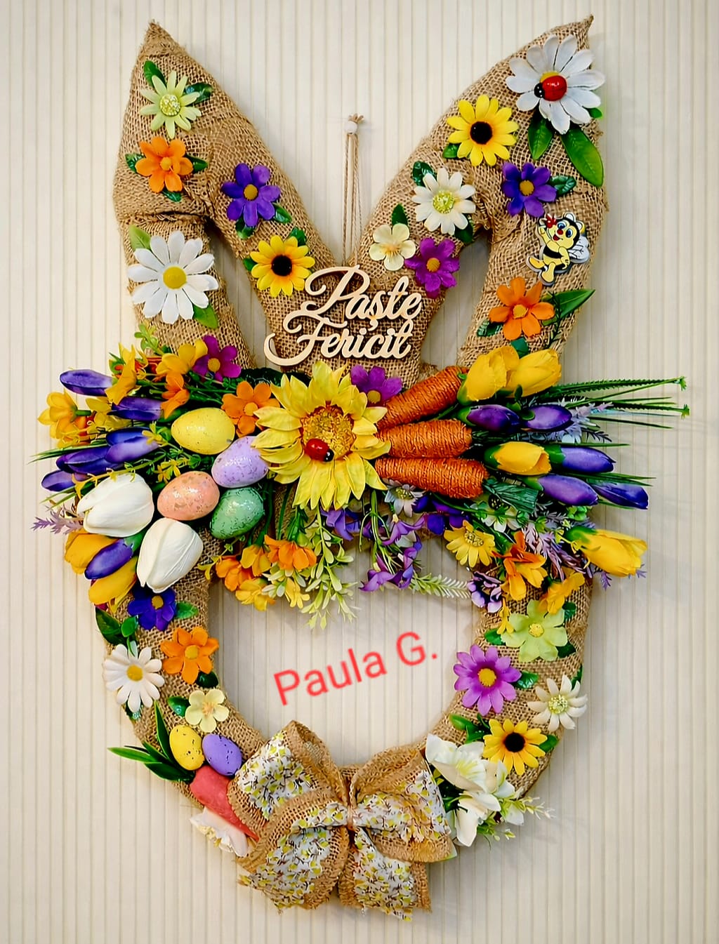 Coroniță Iepuraș de Paște – handmade! Decor deosebit pentru ușă, realizat manual, cu flori colorate de primăvară și design în formă de iepuraș.