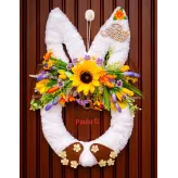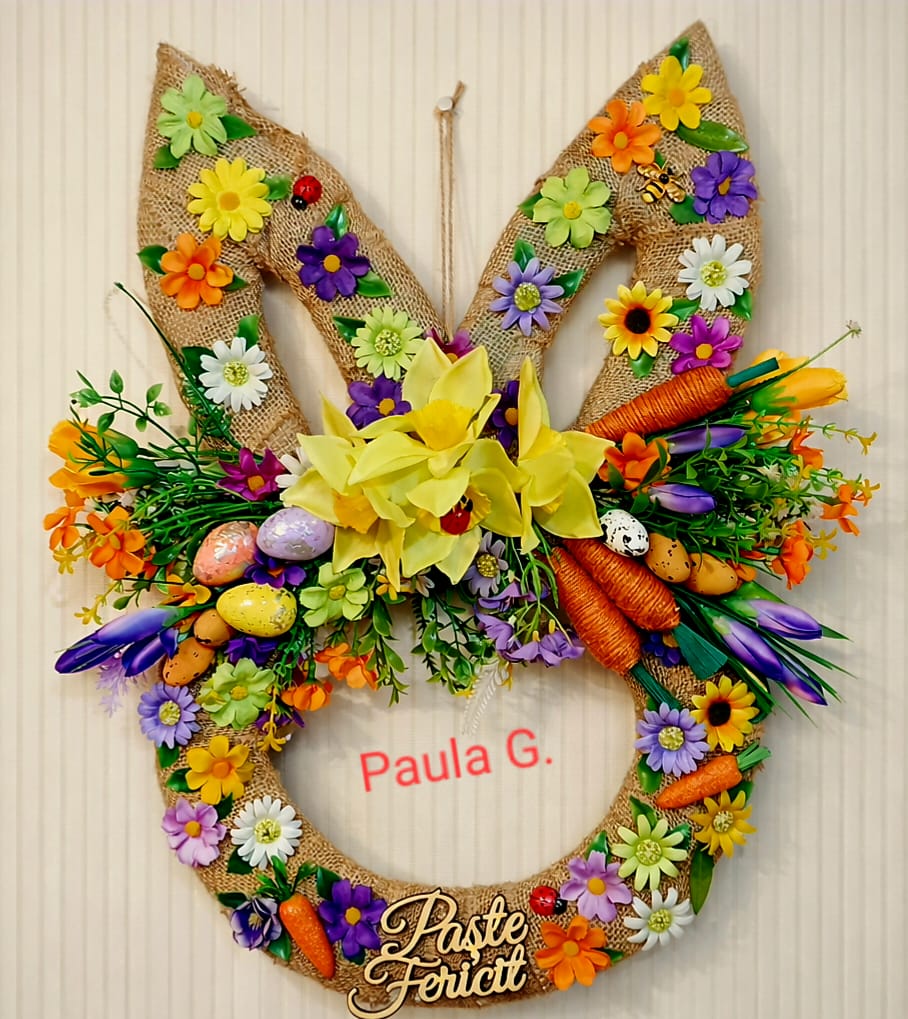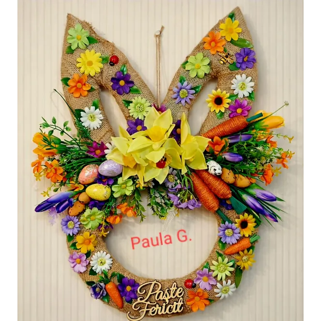 Coroniță veselă de Paște lucrată cu grijă, perfectă pentru a întâmpina sărbătorile cu bucurie și culoare.