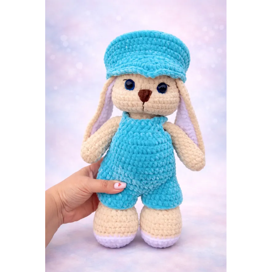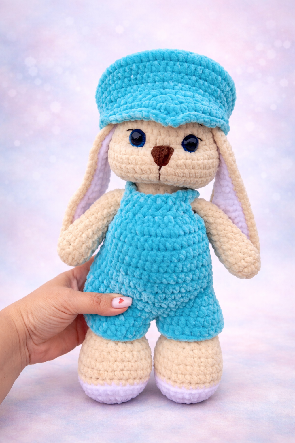 Iepuraș croșetat din pluș moale – jucărie handmade cu salopetă și șapcă bleu Acest simpatic iepuraș croșetat este realizat manual din fir pufos și catifelat, ideal pentru îmbrățișări și momente de joacă. Cu urechi lungi, ochișori albaștri expresivi și ținută asortată — salopetă și șapcă bleu — jucăria are un aspect modern și prietenos, îndrăgit atât de copii, cât și de iubitorii articolelor handmade. Caracteristici:lucrat manual cu atenție la detaliimaterial moale și plăcut la atingeredesign adorabil, potrivit pentru joacă sau decor în camera copiluluiideal pentru cadouri și colecții handmade Dimensiune aproximativă: 35 cm cu sapca ,33 cm fara sapca Întreținere: curățare delicată, manualUn iepuraș pufos, blând și plin de farmec — gata să devină cel mai bun prieten al celor mici!