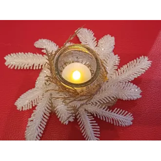 Suport lumanare cu stativ felie lemn, decorat cu crengute albe de brad.