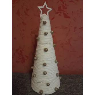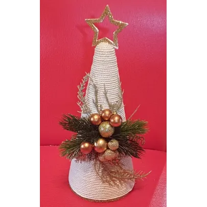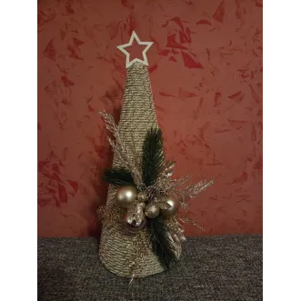 Brad decorativ handmade, 30cm inaltime, acoperit cu snur crem cu insertie aurie, decorat cu globuri si crengute de brad.
