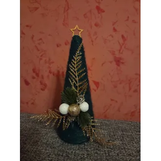 Brad decorativ handmade, 15cm inaltime, acoperit cu fir textil verde inchis, decorat cu globuri si feriga aurie.