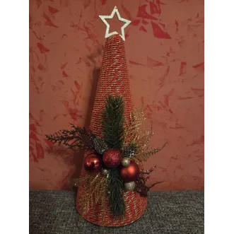 Brad decorativ handmade, 30cm inaltime, acoperit cu snur rosu cu insertie aurie, decorat cu globuri, feriga aurie si crengute de brad.
