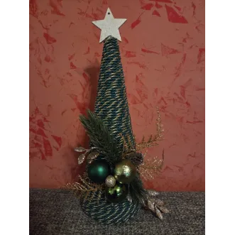 Brad decorativ handmade, 20cm inaltime, acoperit cu snur verde cu insertie aurie, decorat cu globuri, feriga aurie si crengute de brad.