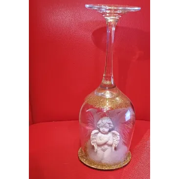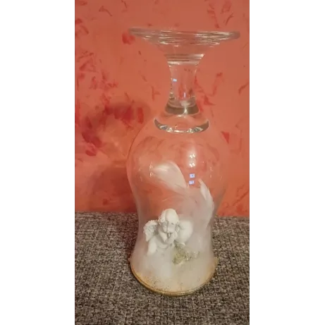 Decoratiune handmade – Îngeraș de iarnă în pahar de sticlă. Această decorațiune unică este realizată manual dintr-un pahar de vin din sticlă întors și transformat într-un glob decorativ elegant.În interior se află un îngeraș delicat, așezat pe un strat de „zăpadă” decorativă, iar marginile sunt atent finisate cu sclipici auriu pentru un efect festiv.Piesa aduce o notă caldă și luminoasă oricărui colț al casei, fiind perfectă pentru sezonul de iarnă, Crăciun sau ca dar simbolic pentru cineva drag. Un obiect decorativ aparte, ideal pentru vitrine, mese festive sau aranjamente tematice.Dimensiuni aproximative: înălțime 15–20 cm (în funcție...