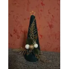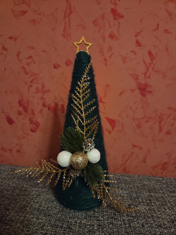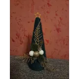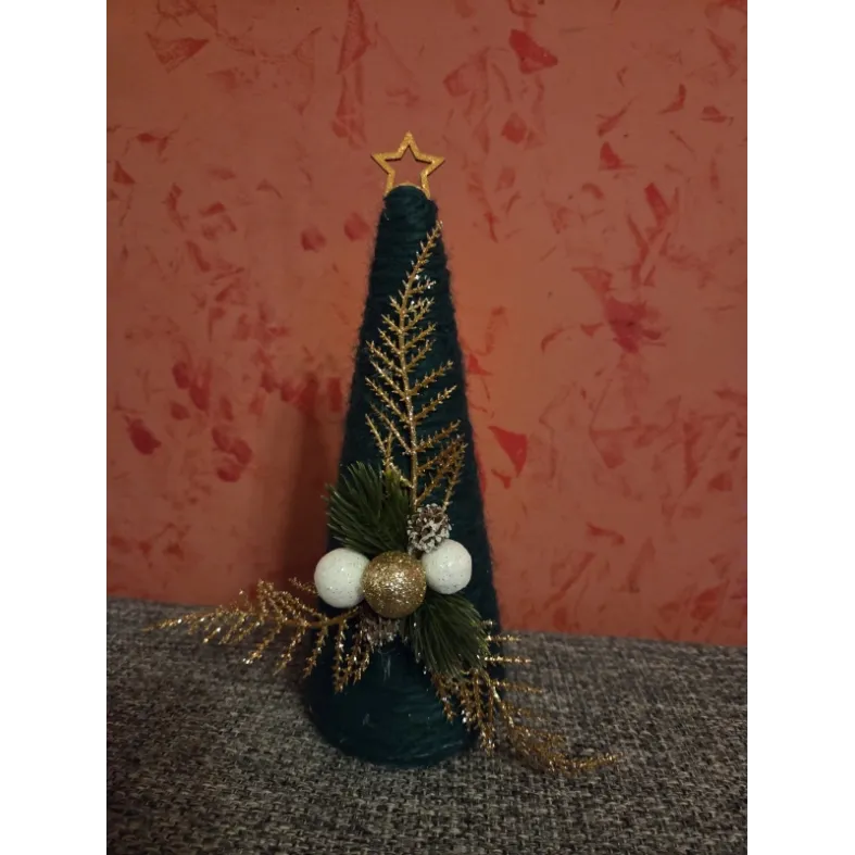 Brad decorativ handmade, 20cm inaltime, acoperit cu snur verde cu insertie aurie, decorat cu globuri, feriga aurie si crengute de brad.