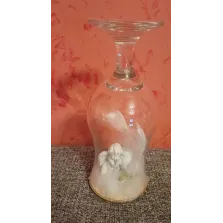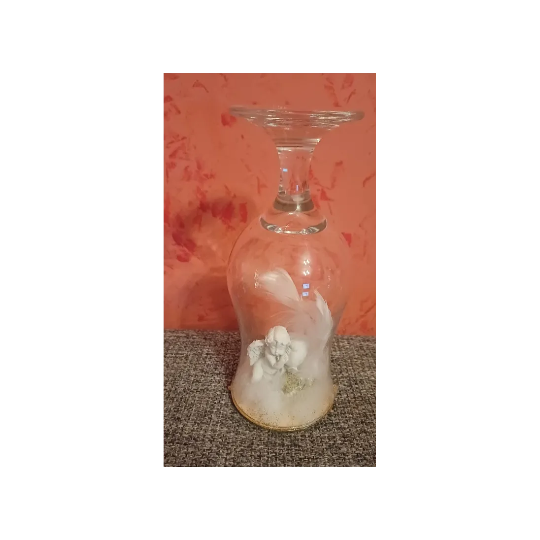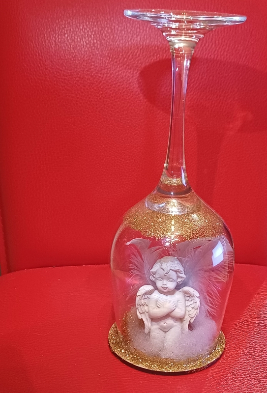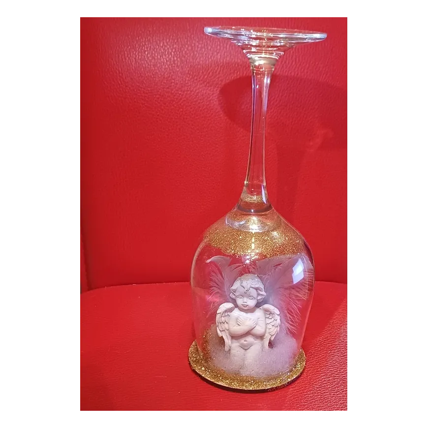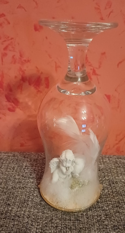 Decoratiune handmade – Îngeraș de iarnă în pahar de sticlă. Această decorațiune unică este realizată manual dintr-un pahar de vin din sticlă întors și transformat într-un glob decorativ elegant.În interior se află un îngeraș delicat, așezat pe un strat de „zăpadă” decorativă, iar marginile sunt atent finisate cu sclipici auriu pentru un efect festiv.Piesa aduce o notă caldă și luminoasă oricărui colț al casei, fiind perfectă pentru sezonul de iarnă, Crăciun sau ca dar simbolic pentru cineva drag. Un obiect decorativ aparte, ideal pentru vitrine, mese festive sau aranjamente tematice.Dimensiuni aproximative: înălțime 15–20 cm (în funcție de pahar) Materiale: pahar de sticlă, figurină îngeraș, zăpadă decorativă, glitter auriu, suport stabil.