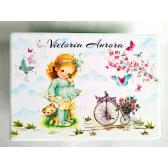 Produs decorat manual, personalizat în mod delicat si unic, creat special pentru a adăuga o nota de farmec evenimentului copilului tău. Cutia este din mdf  decorată cu vopsele acrilice si bine lăcuită pentru rezistență la uzură, fără a-și modifica aspectul în timp. Tehnica de realizare este pictură basic si transfer de imagine. Poate fi folosită după eveniment pentru păstrarea amintirilor si lucrușoarelor prețioase de-a lungul anilor. Pentru că sunt realizate manual, reproducerea lor poate avea ușoare diferențe de nuanțe sau dimensionare a imaginilor.